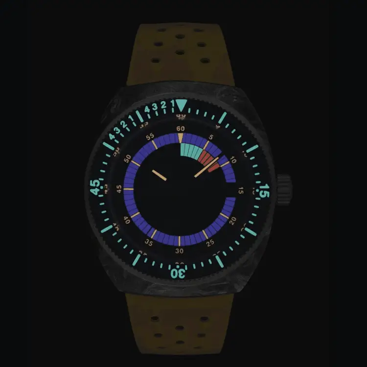 The watch case is made of lightweight forged carbon and has a characteristic 'tonneau' (barrel) shape. The black dial features bold yellow minute markers, green and red accents, and Super-LumiNova® coated luminescent hands for improved readability in the dark. The sapphire crystal is anti-reflective and scratch-resistant, ensuring the watch's longevity.