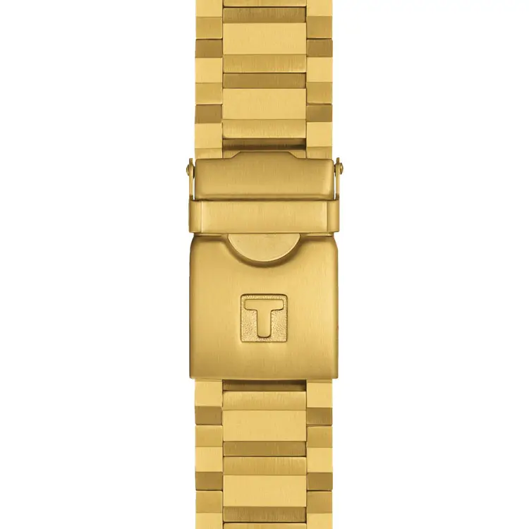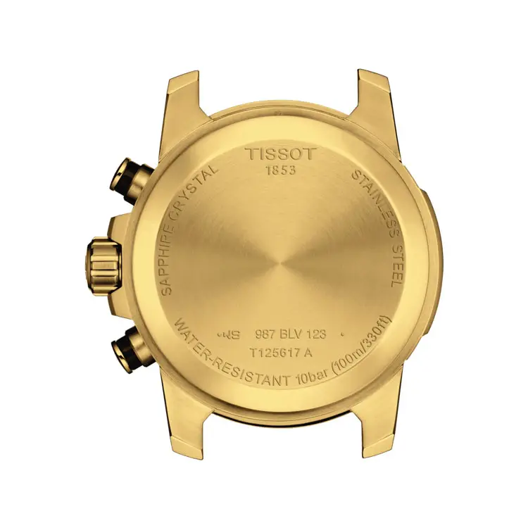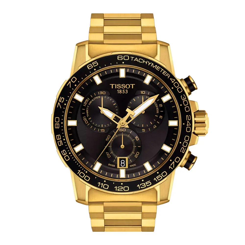 The Tissot Supersport Chrono T125.617.33.051.01 embodies power, energy, and Swiss precision in a bold, athletic design. Its 45.5mm stainless-steel 316L case with yellow gold PVD coating is paired with a black sunburst dial, featuring contrasting sub-dials, a tachymeter bezel, and hands coated with Super-LumiNova® for optimal legibility.