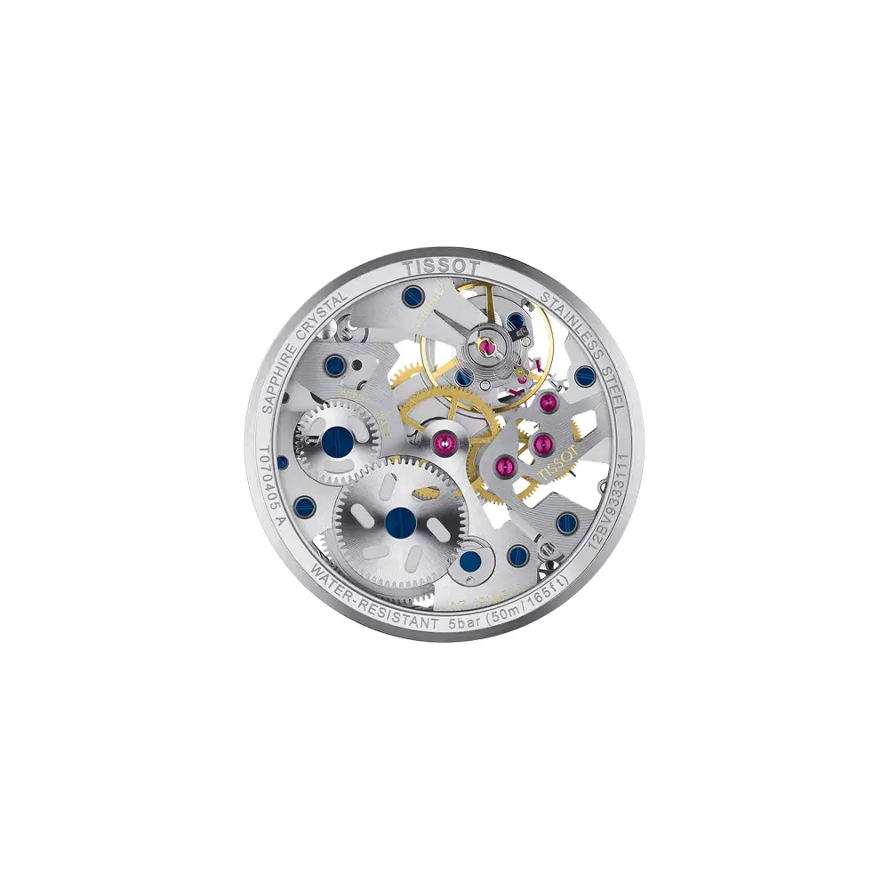 The Tissot T-Complication Squelette T070.405.16.411.00 combines traditional Swiss watchmaking craftsmanship with modern technical design. Its standout feature is the iconic skeleton dial, revealing the finely crafted mechanical movement ETA 6497-1 with manual winding, 17 jewels, a frequency of 18,000 vibrations per hour, and a power reserve of approximately 46 hours. A transparent case back lets you admire the mechanism from both sides, making these watches a true masterpiece for mechanical watch enthusiasts.