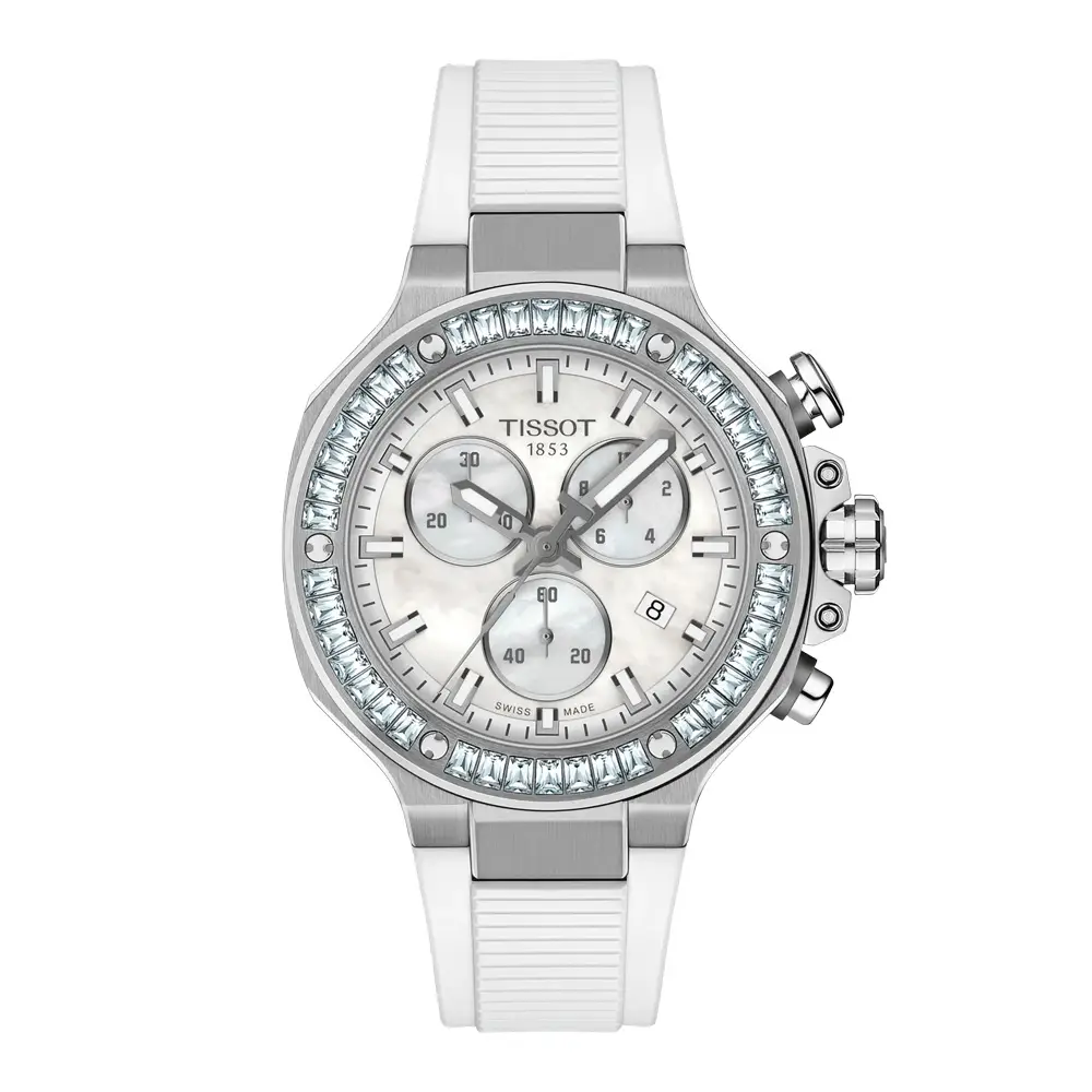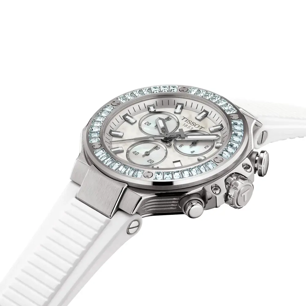 The T-Race watch combines motor-sport-inspired design with a bright, elegant aesthetic — the white mother-of-pearl dial paired with a white silicone strap creates a modern, feminine yet functional look. The 316L stainless-steel case and a bezel set with sparkling stones add a refined, luxurious touch, while the shaped details reference the dynamic spirit characteristic of the T-Race collection.