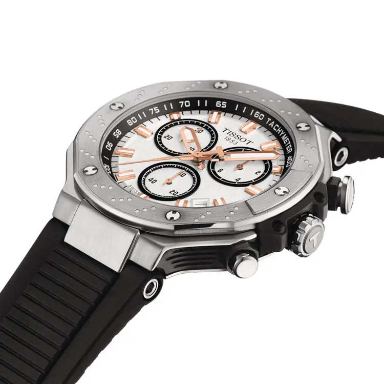 The T-Sport models offer a wide range of functions: chronographs, tachymetric scales, screw-down crowns, water resistance up to 300 m, and all in robust cases made of stainless steel, ceramic or titanium. Distinctive dials and sporty straps in rubber, textile or metal guarantee comfort and durability during intensive use.