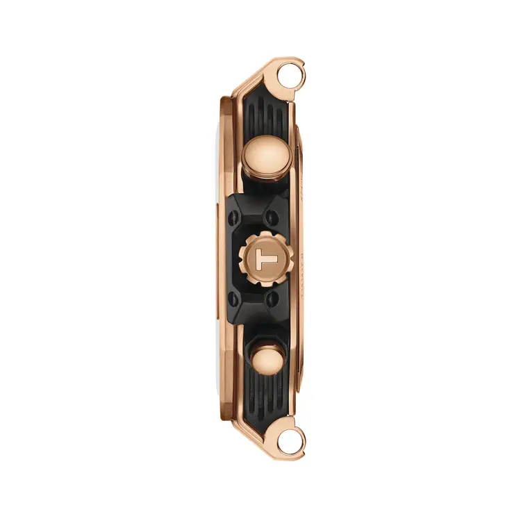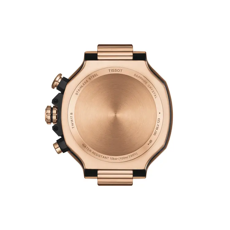 The Tissot T-Race Chronograph T141.417.37.051.00 is a sporty model inspired by the world of motorcycle racing. Its bold 45mm 316L stainless steel case with a rose-gold PVD coating is paired with a black dial featuring contrasting details that highlight its dynamic and powerful character. Design cues such as the brake disc–shaped bezel and handlebar-inspired pushers reflect the collection’s racing DNA.