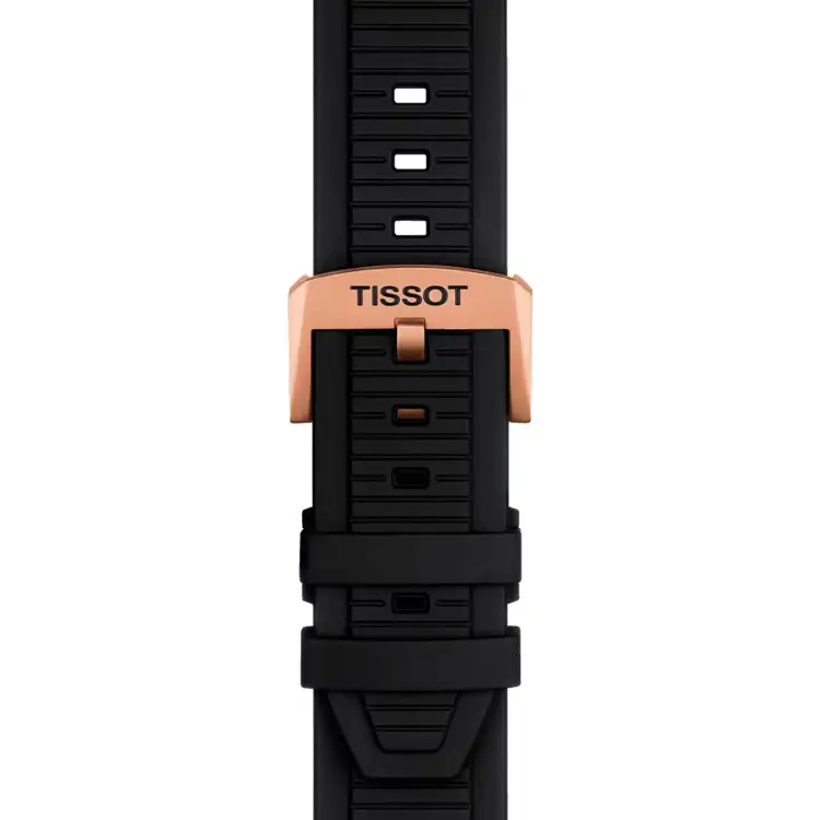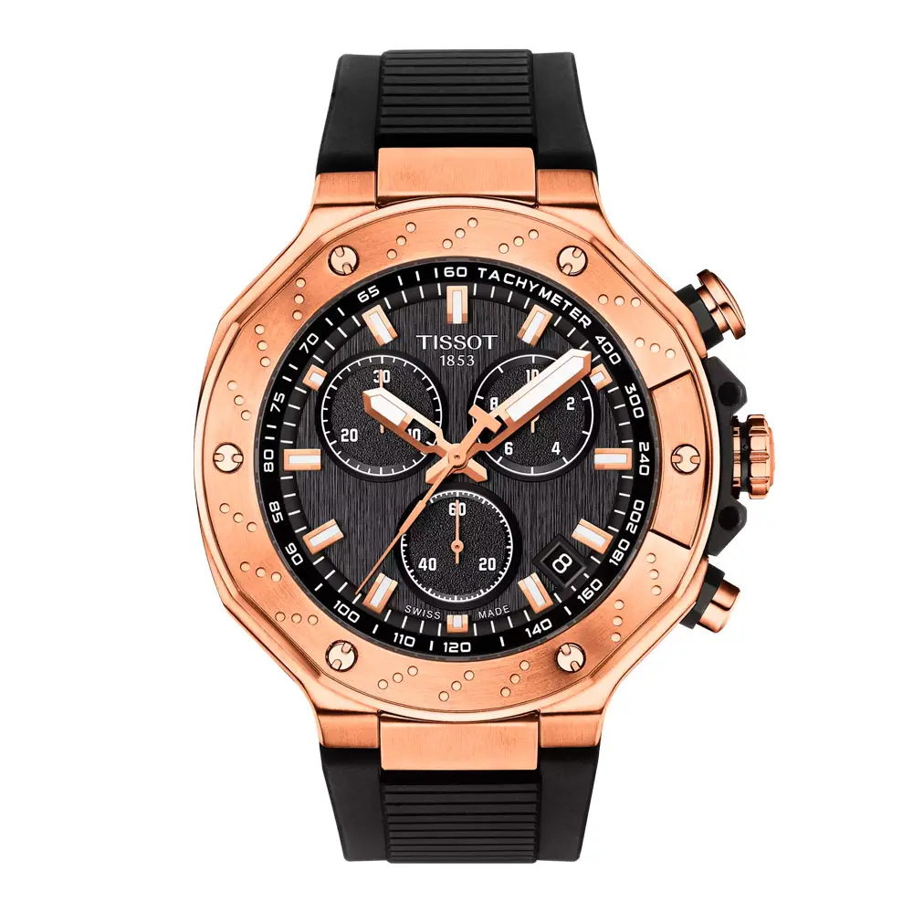 A black rubber strap ensures comfort and sporty appeal. The Tissot T-Race Chronograph, in its elegant mix of black and rose gold, perfectly expresses energy, precision, and Swiss quality — designed for those who value performance and style.