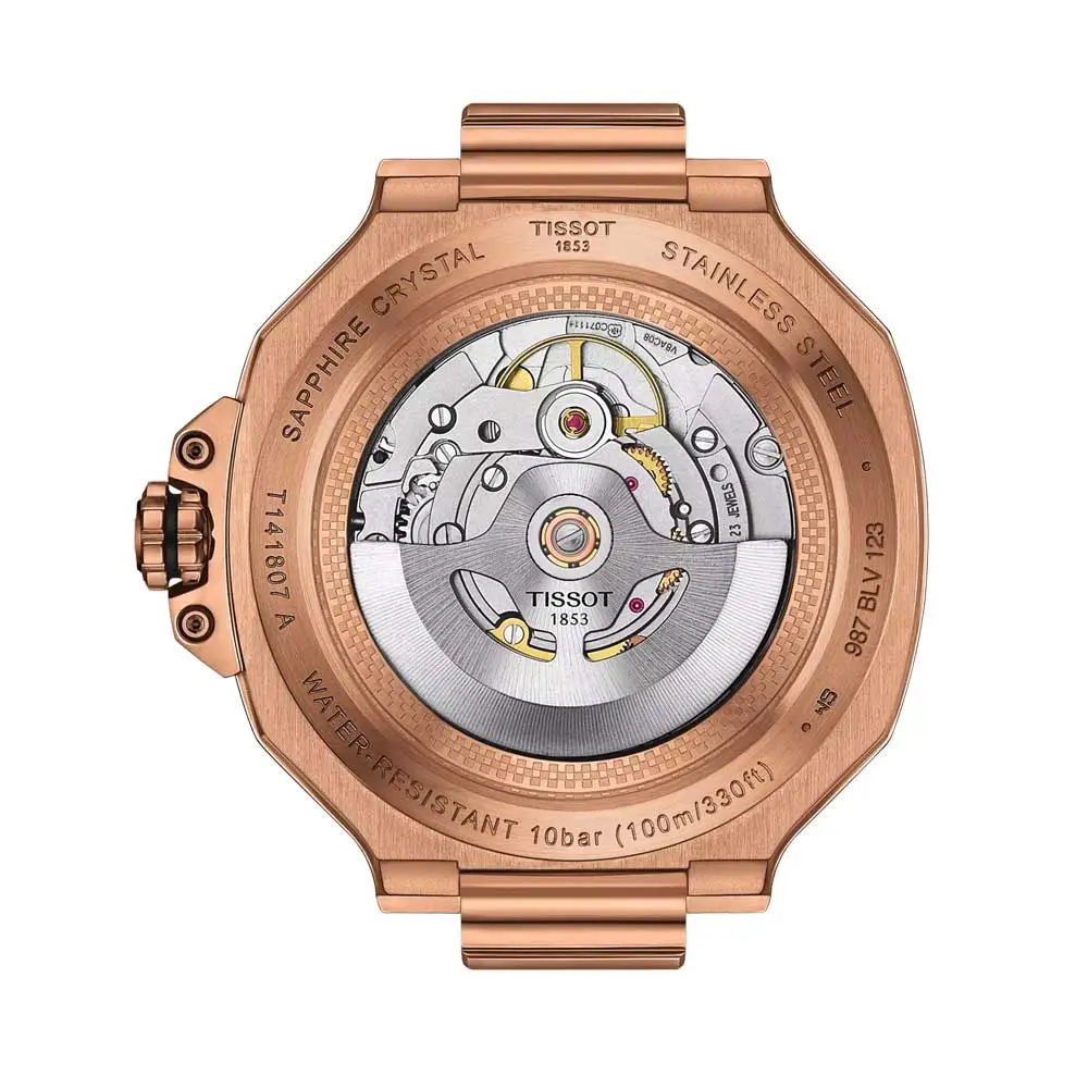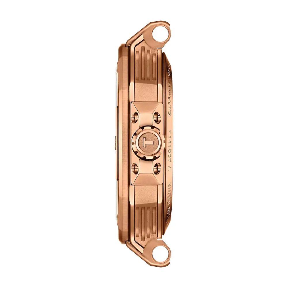 The Tissot T-Race Powermatic 80 41mm T141.807.37.051.00 unites Tissot’s racing DNA with Swiss mechanical excellence. Its 41mm stainless-steel 316L case with rose-gold PVD coating is paired with a black textured dial with bold indices, inspired by the design of motorcycle dashboards.