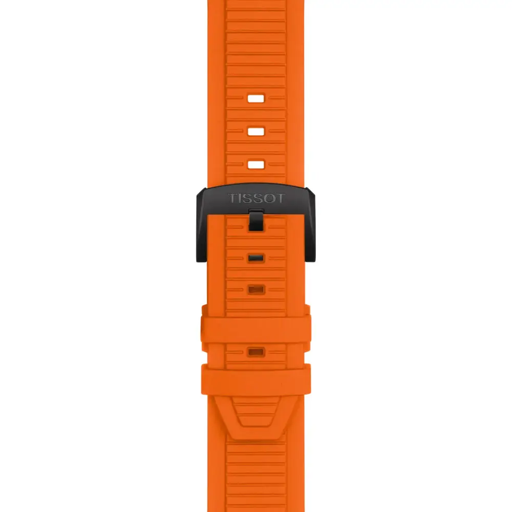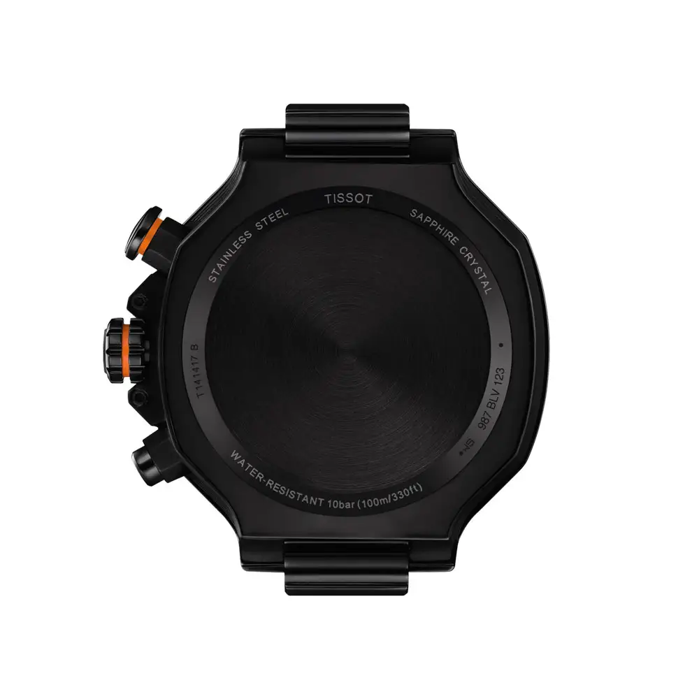 The Tissot T-Race Quartz Chronograph T141.417.37.051.02 embodies a passion for motor racing, performance, and Swiss precision. Its 45mm stainless-steel 316L case with black PVD coating is paired with a black dial featuring bold orange accents, inspired by the aesthetics of motorcycle design.