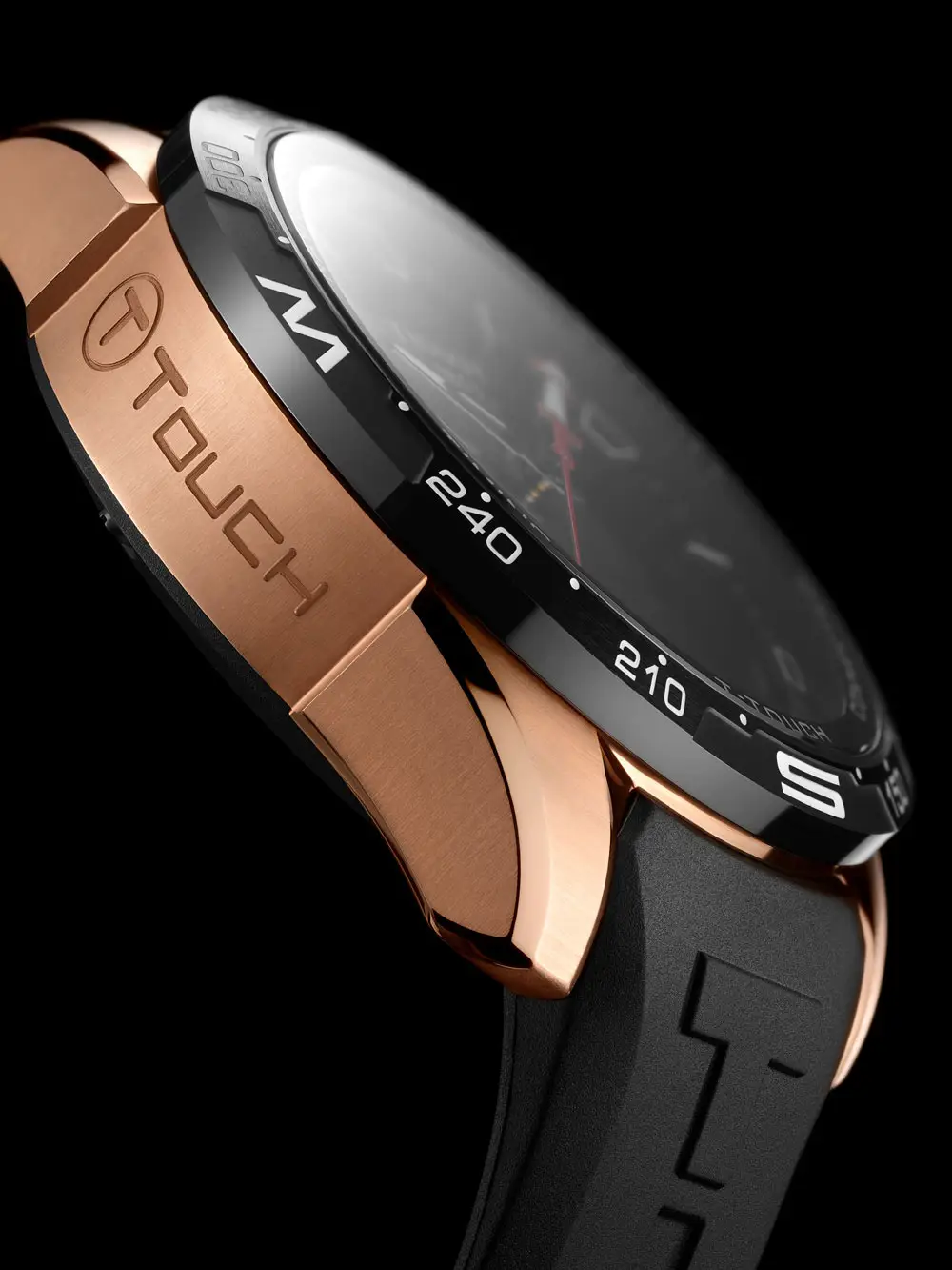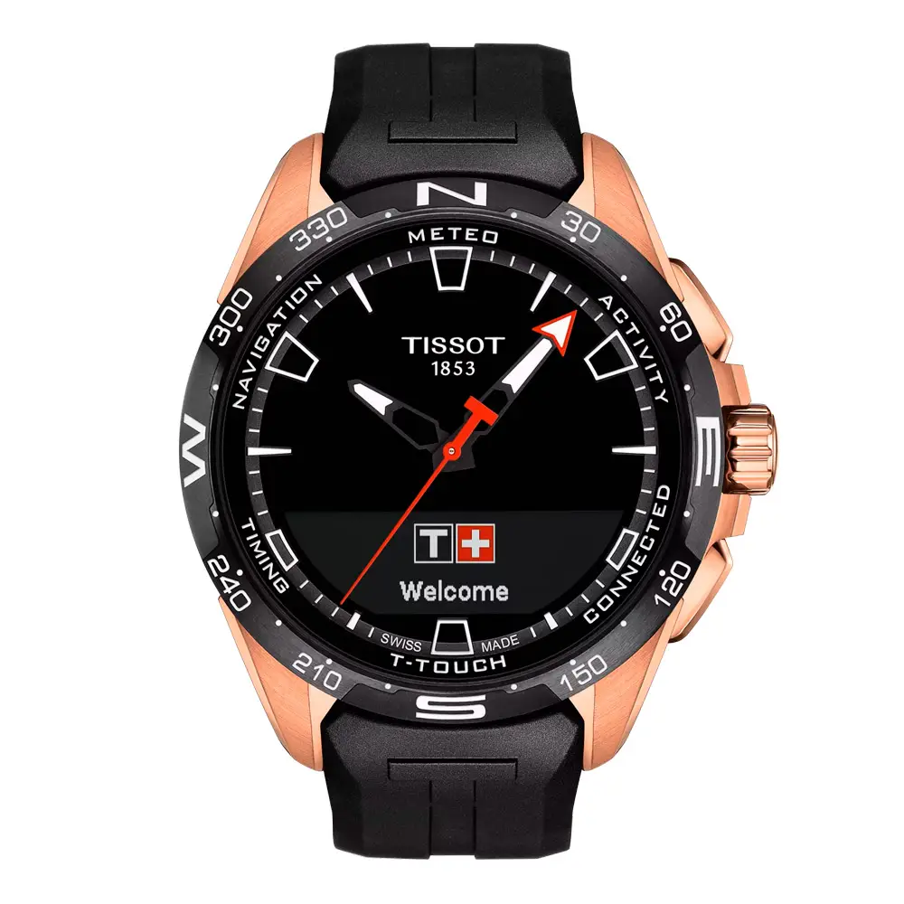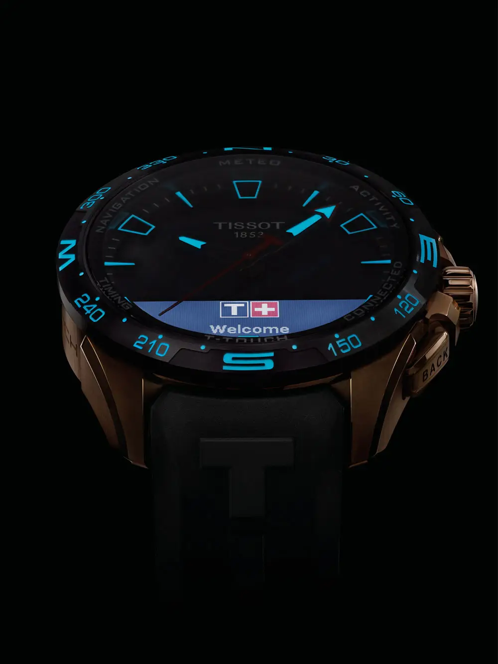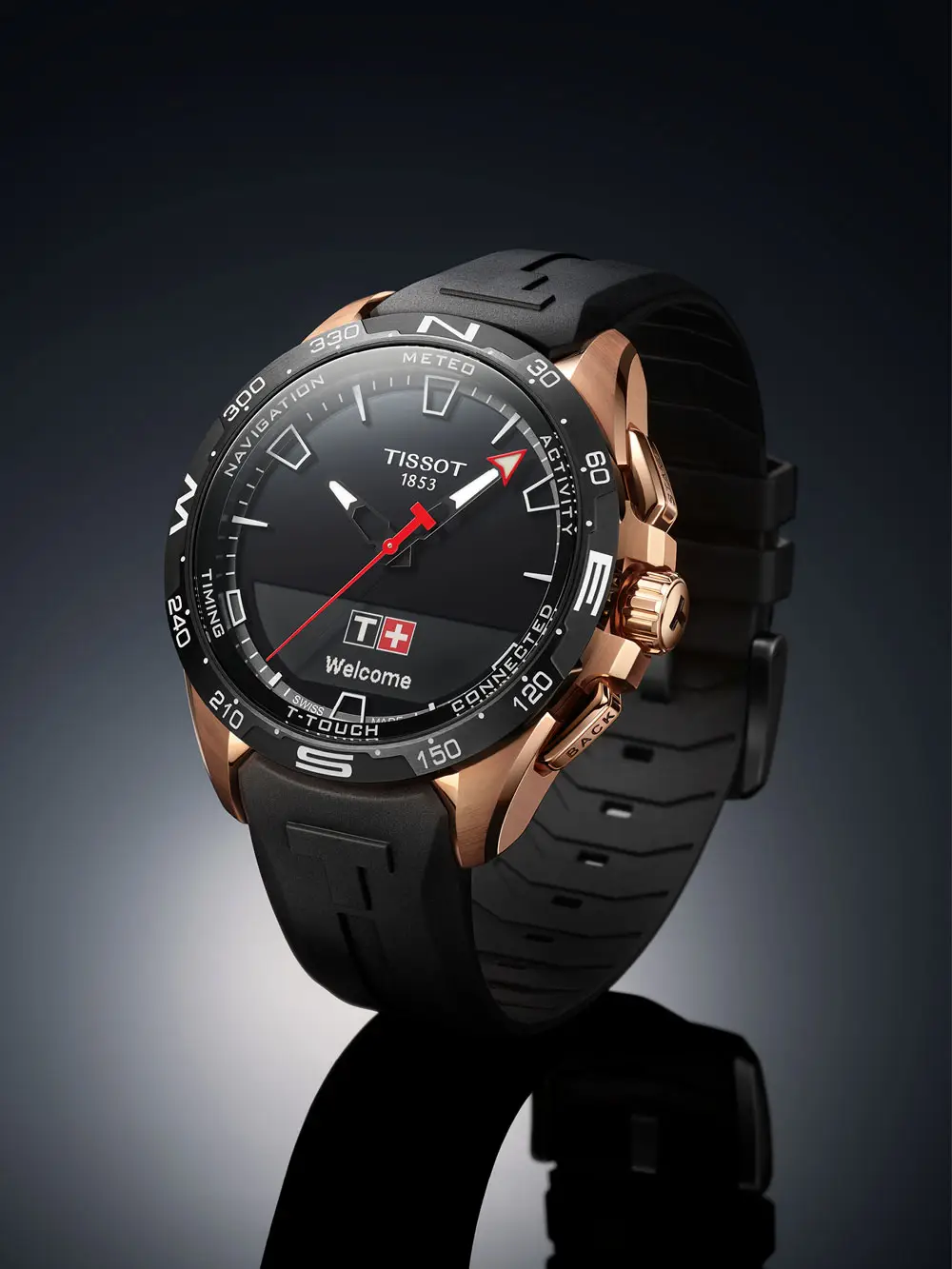 The Tissot T-Touch Connect Solar represents the pinnacle of modern technology, solar innovation, and sporty Swiss design. Positioned between traditional and smart watches, it perfectly blends classic horology with digital connectivity. The titanium case with rose gold PVD coating and ceramic bezel frames a hybrid analog-digital dial, protected by a scratch-resistant sapphire crystal.