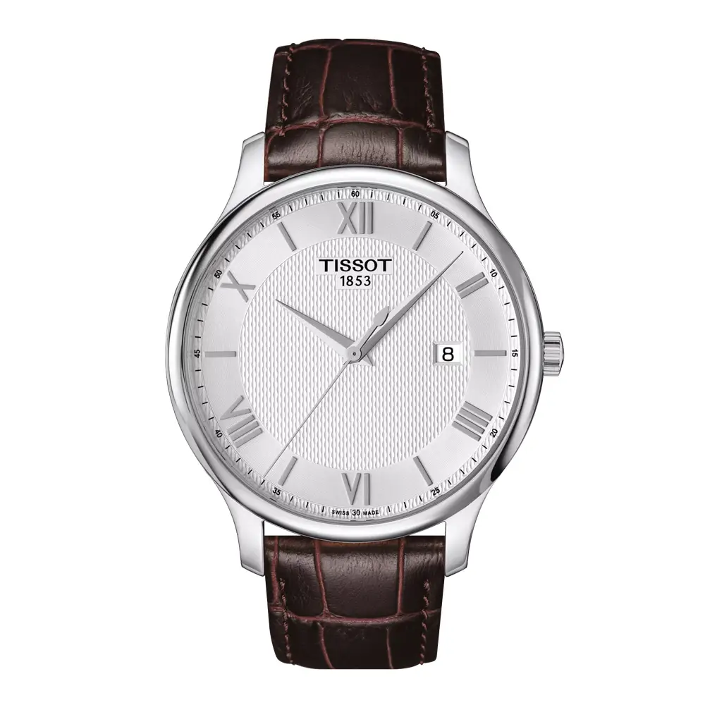 The Tissot Tradition T063.610.16.038.00 blends classic design with modern elegance and Swiss precision. Its 316L stainless-steel case with a 42 mm diameter gives the watch a strong yet well-balanced presence. The silver dial features Roman numerals and refined indices, creating a timeless and sophisticated look complemented by a comfortable brown leather strap.