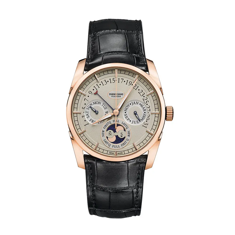 The Parmigiani Fleurier Tonda Calendrier Annuel, reference PFC272-1002401-HA1242, is a masterpiece of Swiss haute horlogerie, combining classic elegance, advanced mechanics, and exceptional watchmaking craftsmanship. This 40 mm model is crafted from 18kt rose gold, giving it a warm and luxurious appearance, further enhanced by a hand-stitched brown Hermès alligator leather strap.