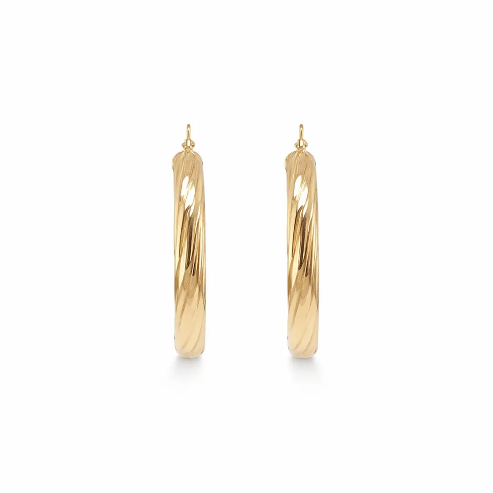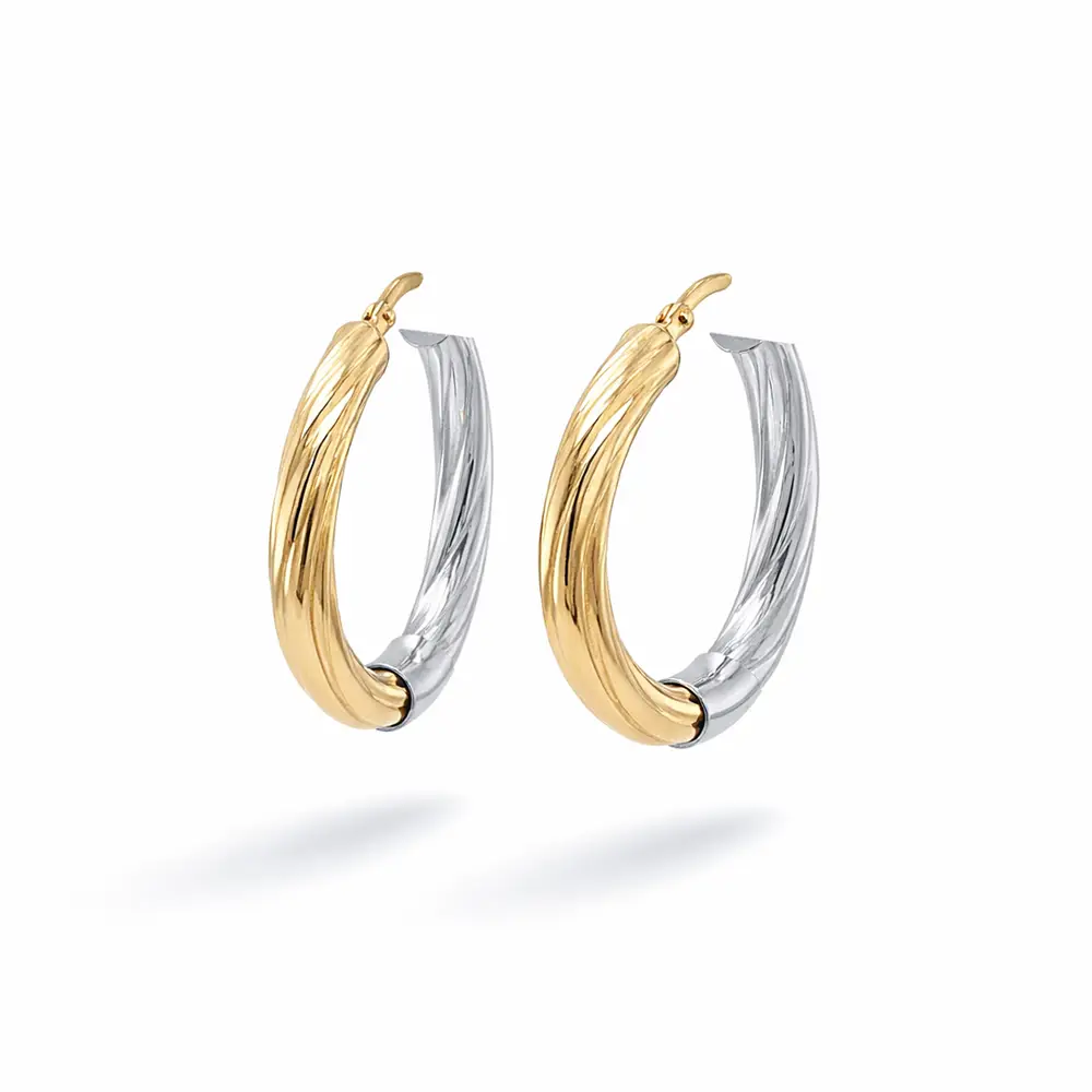 These two-tone gold hoop earrings captivate with an elegant contrast of yellow and white gold, creating a timeless yet distinctive look. The subtly contoured surface reflects light beautifully, making them suitable for both everyday wear and special occasions.