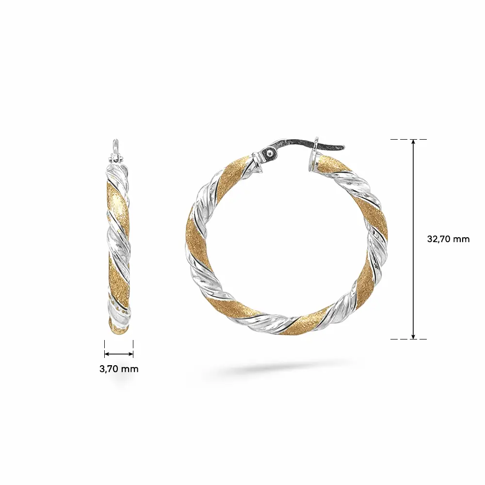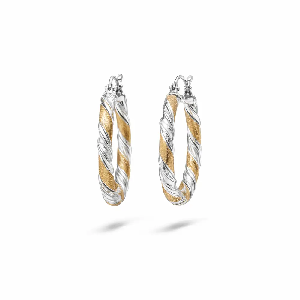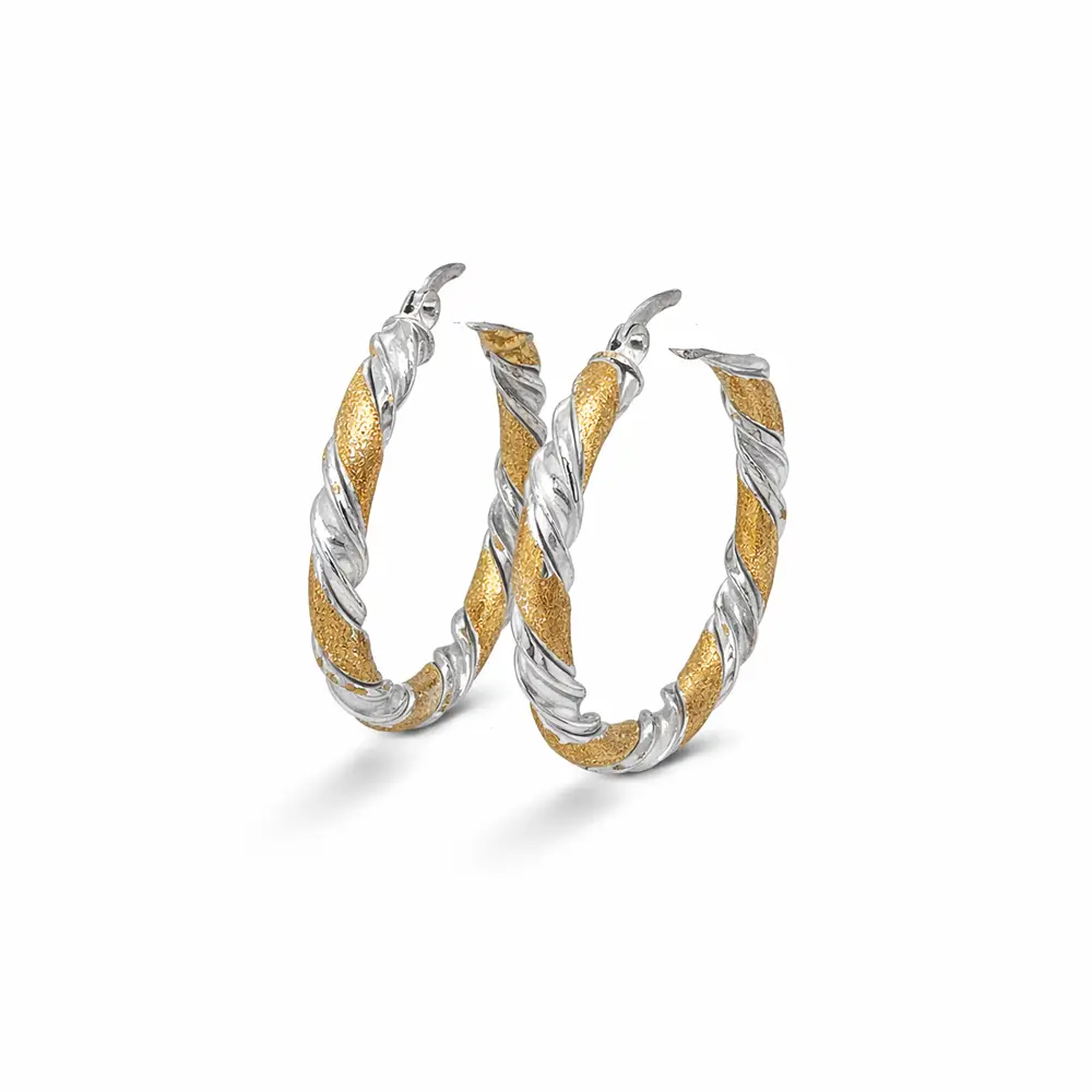 These two-tone gold hoop earrings stand out with an elegant spiral design that combines smoothly polished white gold with finely textured yellow gold. The contrast of surfaces creates a modern yet timeless look, beautifully reflecting light and giving the jewelry a distinctive character.