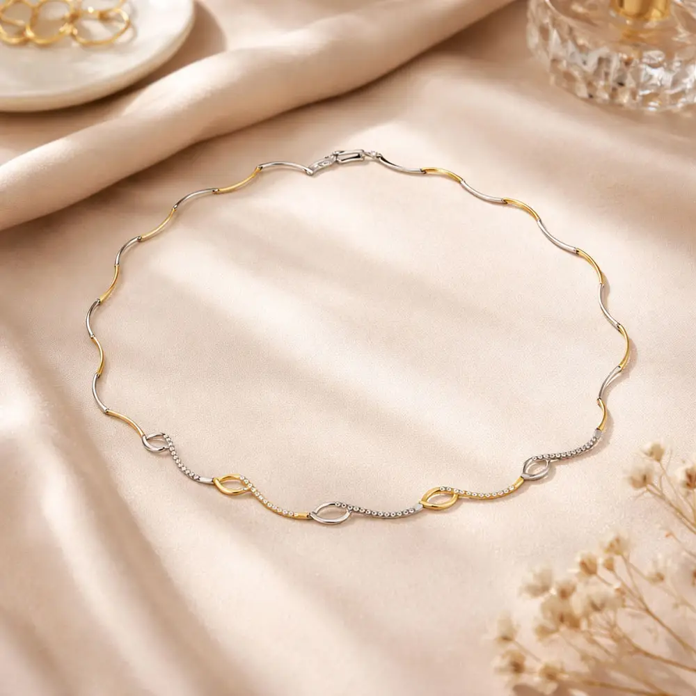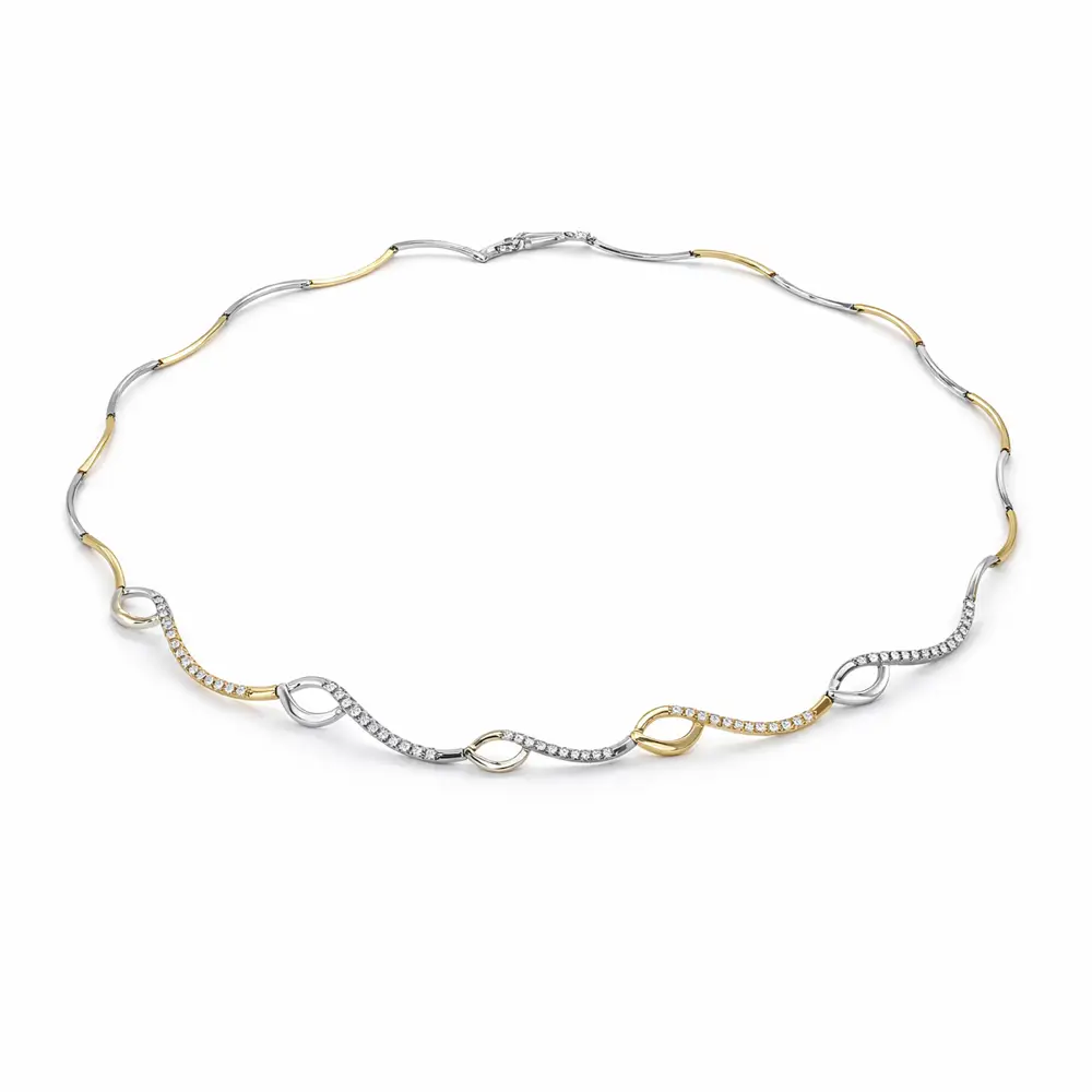 This elegant two-tone gold necklace impresses with a harmonious combination of yellow and white gold, complemented by delicately set zirconia stones. The flowing, wave-inspired links create a refined and modern look, while the zirconia subtly reflect light, enhancing the necklace’s luxurious character without appearing excessive.
