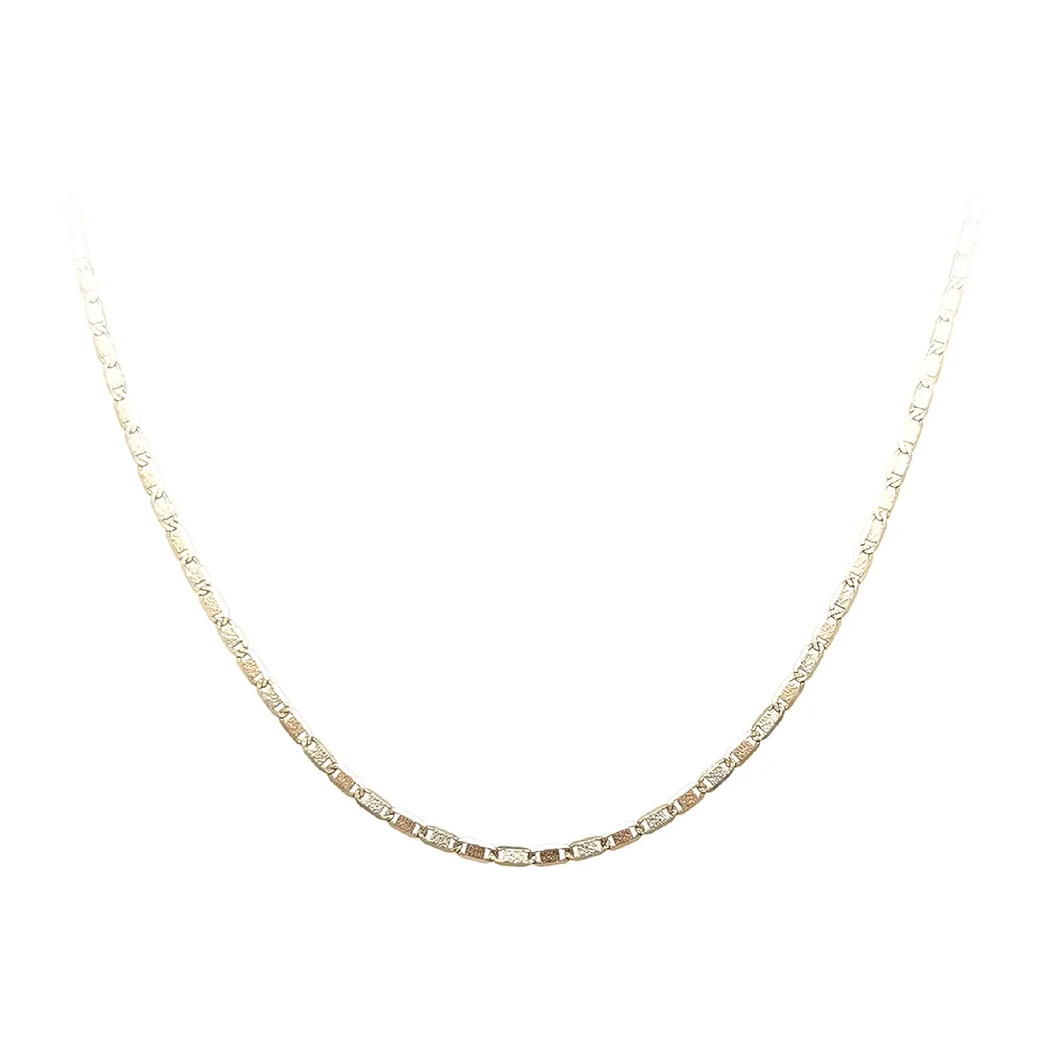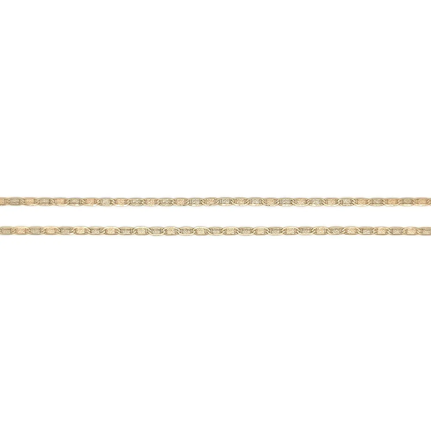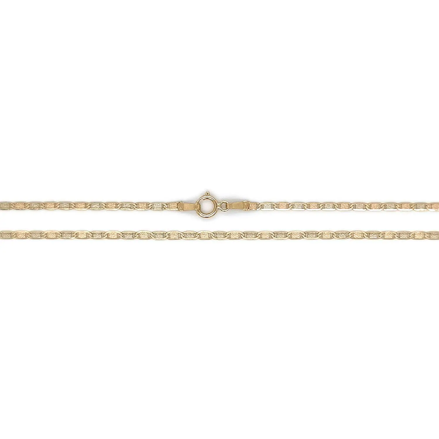This elegant two-tone razor-link chain stands out with its precisely cut elongated links that create a distinctive look and an intense shine. The combination of two shades of gold adds depth and sophistication, giving the piece a modern and stylish character suitable for both women and men.