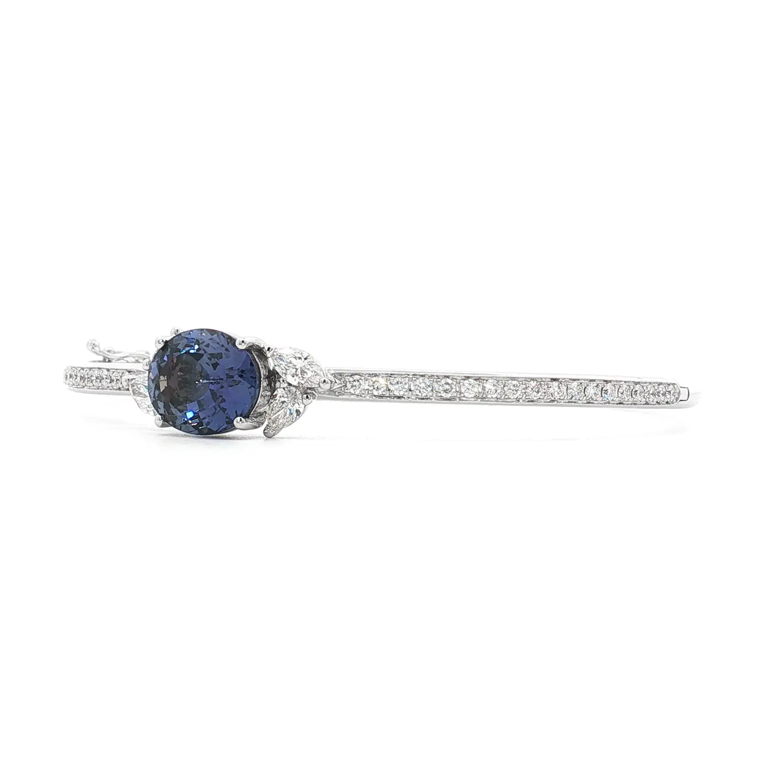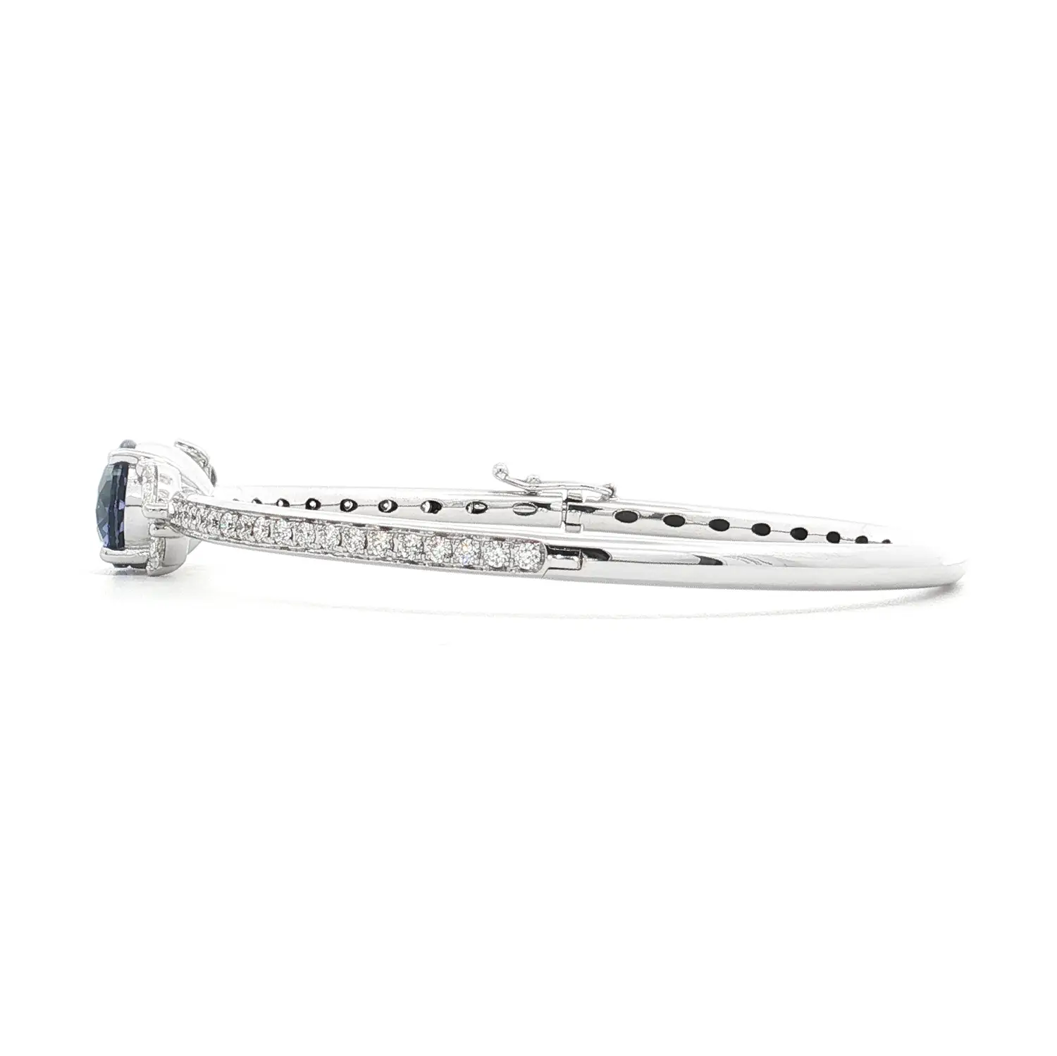 This refined white gold bracelet is a masterpiece of elegance and sophistication. Its centerpiece — an oval-cut tanzanite — shimmers in mesmerizing violet-blue hues that shift beautifully with the light. Framed by brilliant-cut diamonds on both sides, the gemstone radiates depth and brilliance, while the sleek design adds a touch of timeless grace.