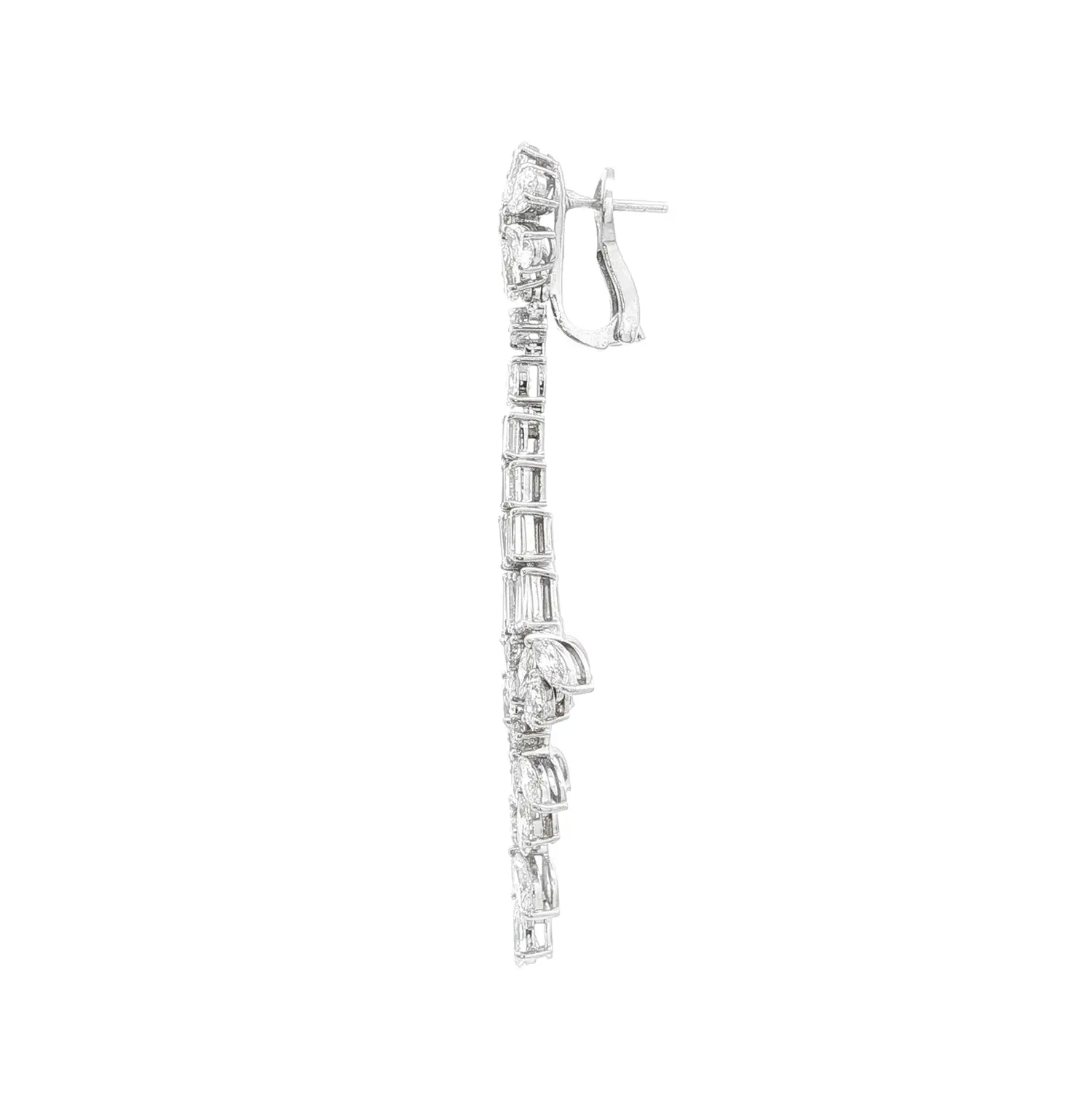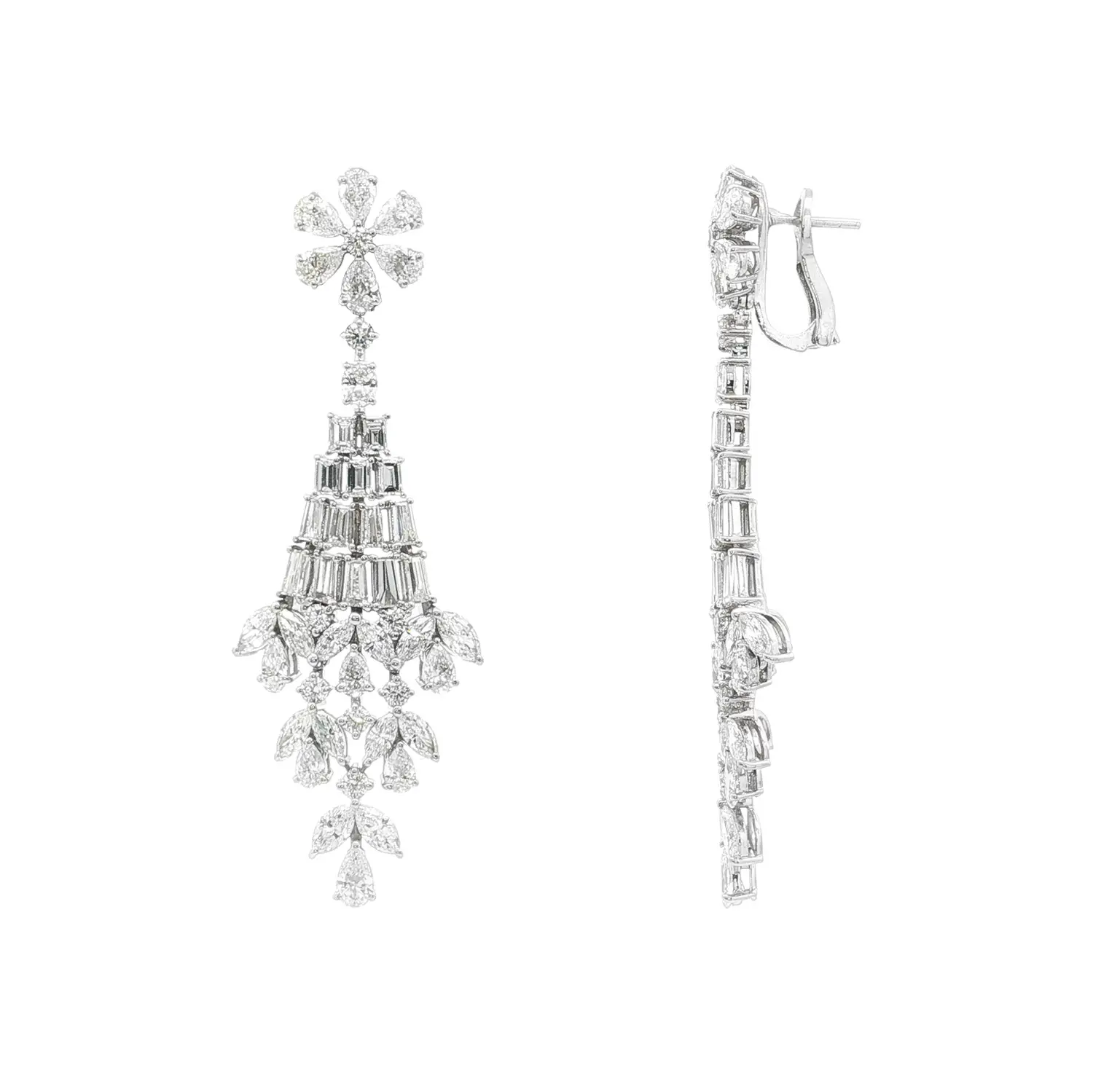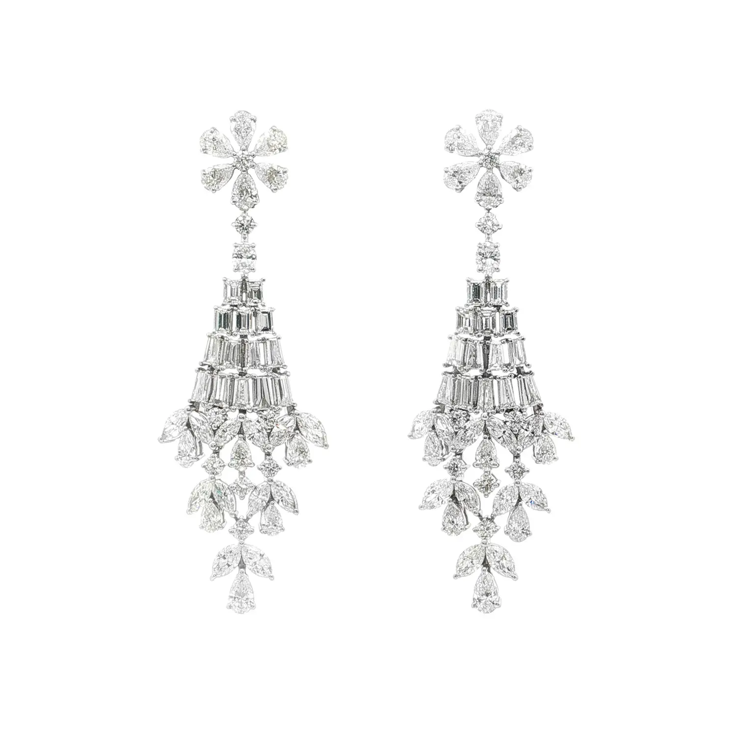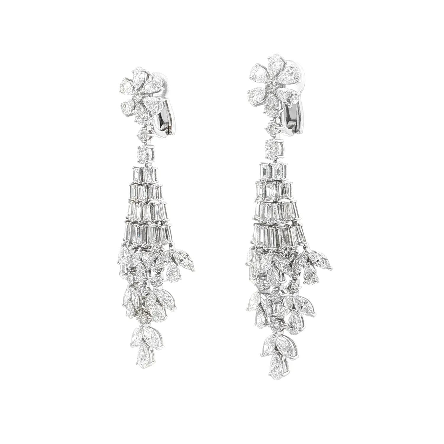 These exquisite white gold chandelier earrings are a true masterpiece of fine jewelry, combining perfect craftsmanship, symmetry, and radiant brilliance. Their design unfolds in graceful tiers, with the top floral motif composed of pear-shaped diamonds leading into a tapered cascade of baguette- and pear-cut diamonds. The multi-layered composition captures and reflects light beautifully, creating a breathtaking sparkle with every movement.
