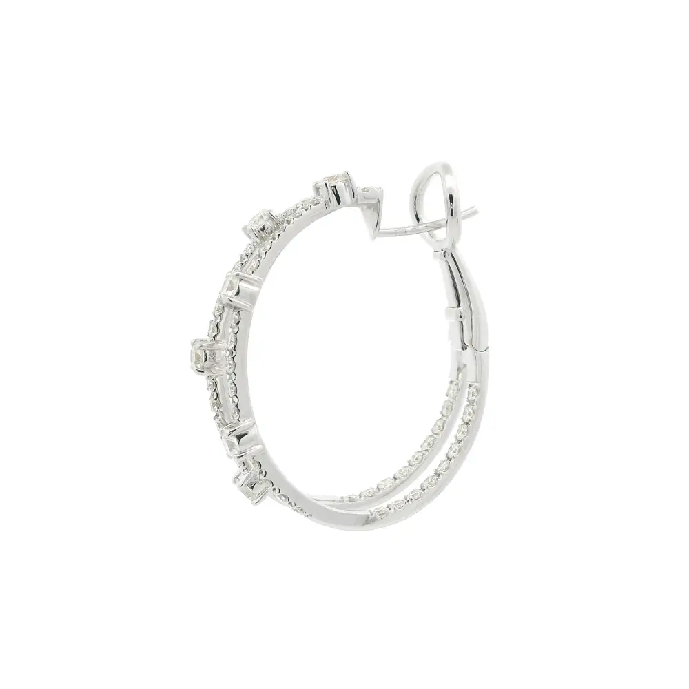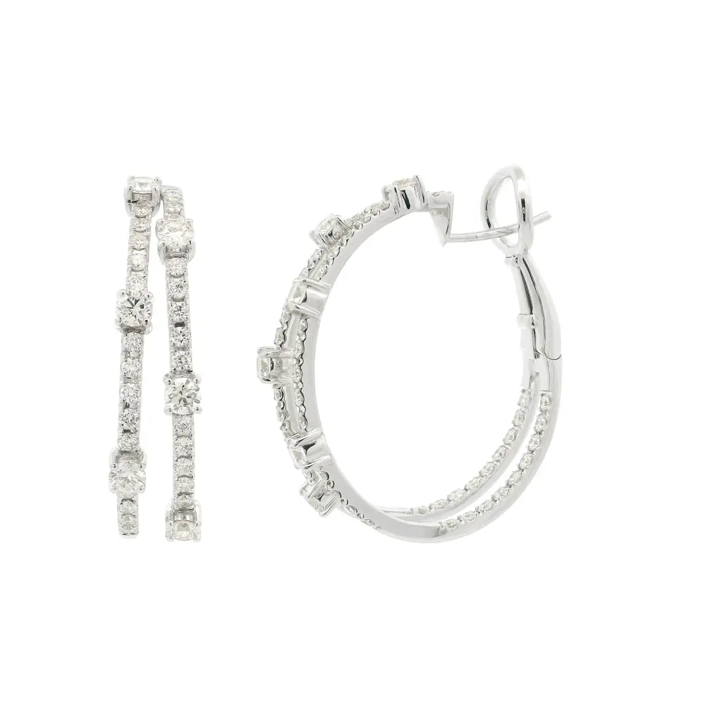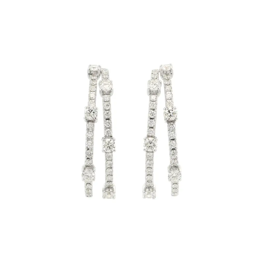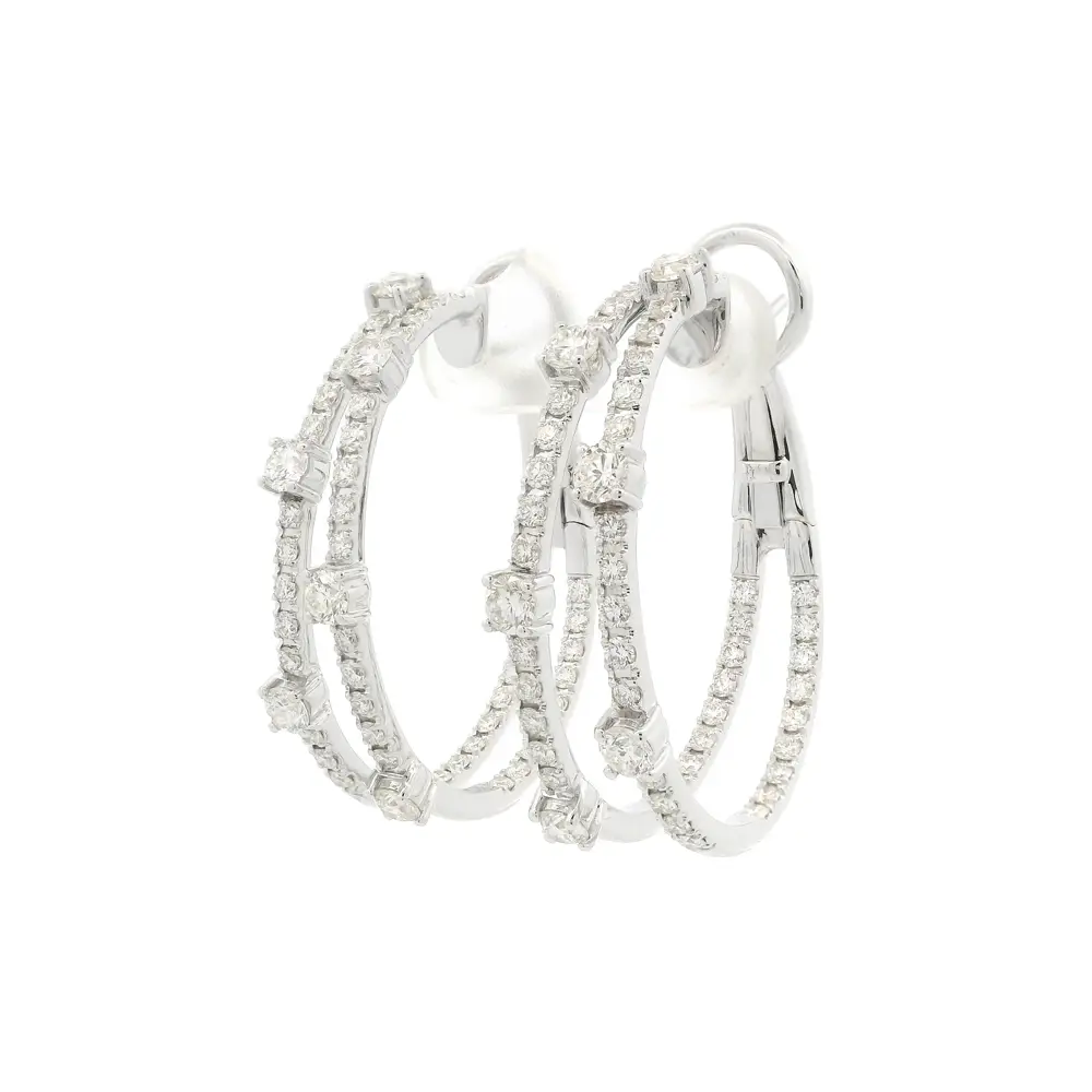 These elegant 18K white gold earrings captivate with their refined brilliance and graceful motion. The double-hoop design is adorned with carefully set brilliant-cut diamonds of varying sizes, creating a dynamic sparkle and a stunning sense of depth.