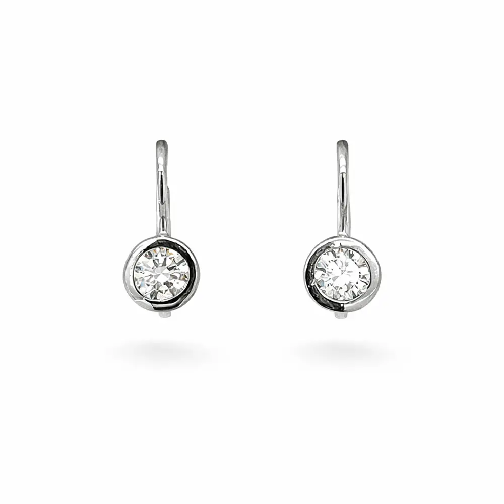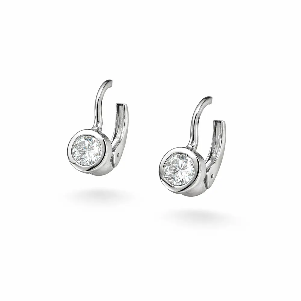 These delicate white gold drop earrings are adorned with a central cubic zirconia set in a round bezel, giving the jewelry a clean sparkle and timeless elegance. The minimalist design highlights the brilliance of the stone and feels refined and subtle, making the earrings suitable for everyday wear as well as more formal occasions.