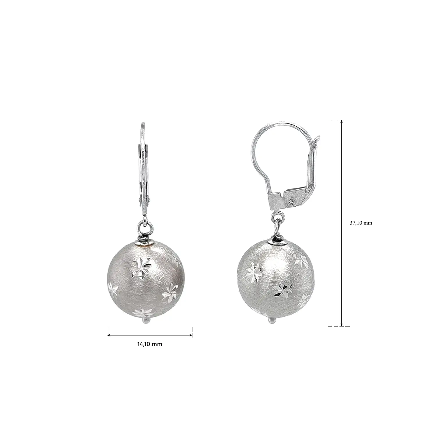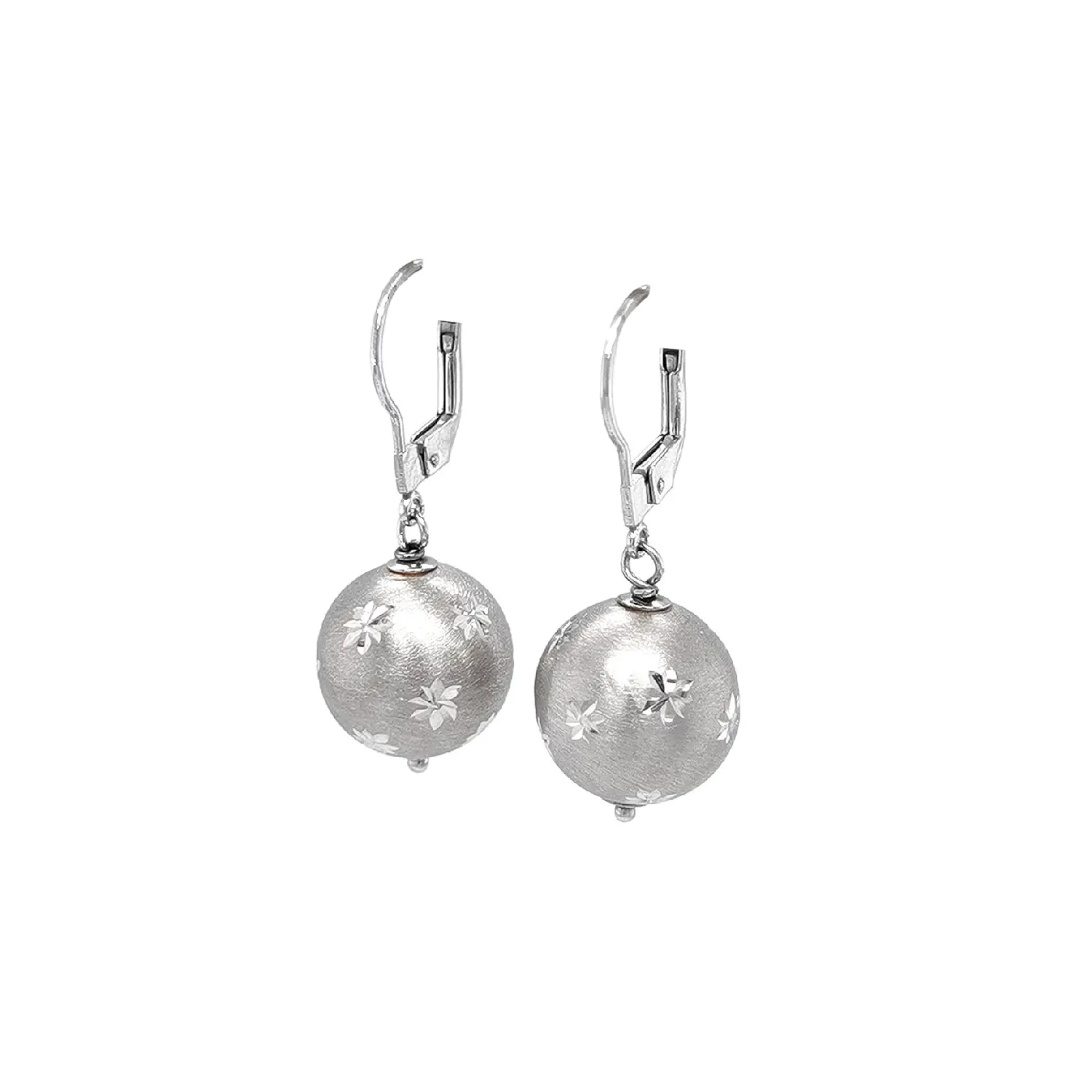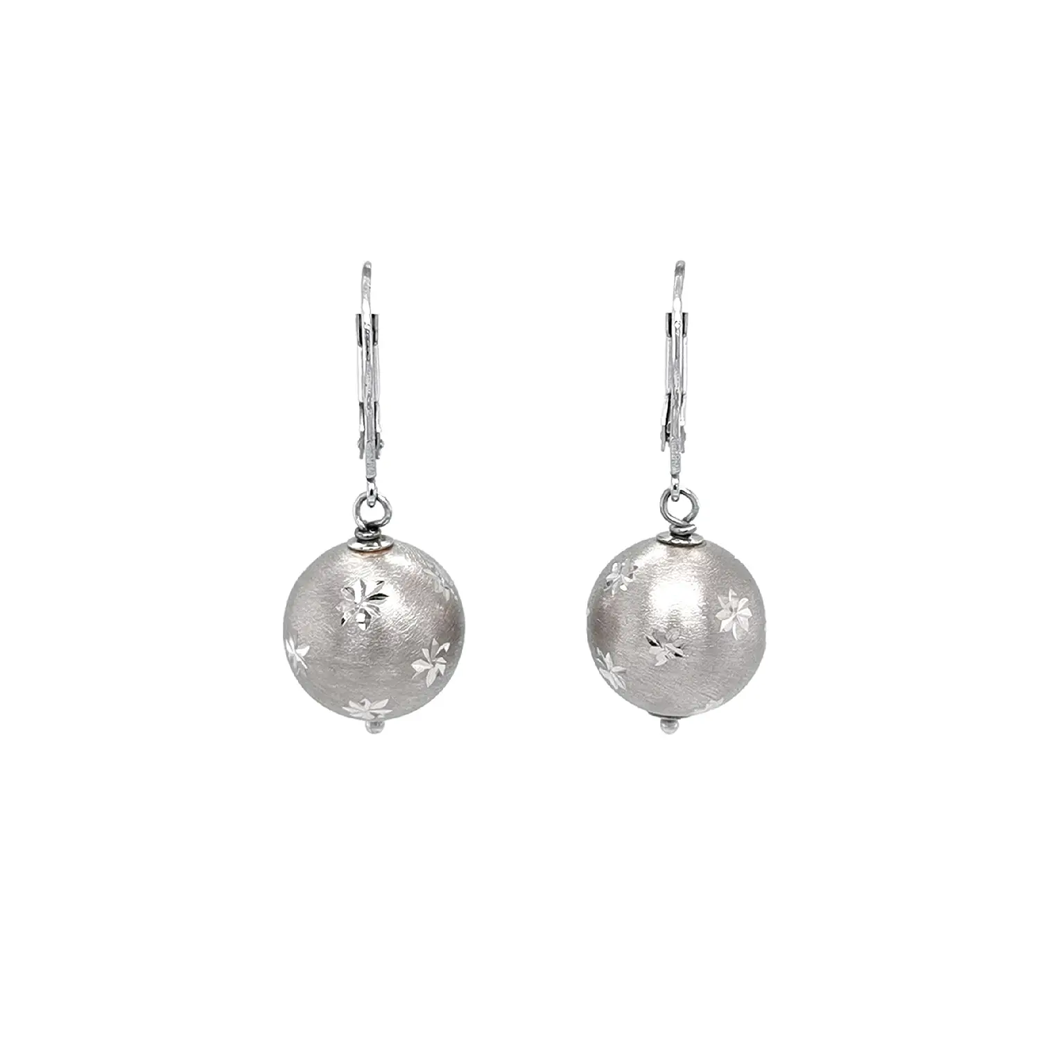 These white gold drop earrings with a spherical motif captivate with their finely textured surface and decorative engraving in the shape of small stars. The matte finish combined with subtle polished details creates an elegant contrast, giving the jewelry a light and festive character.