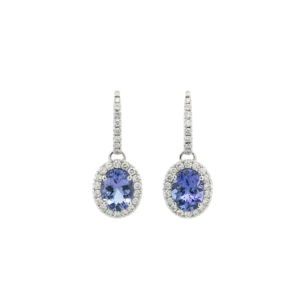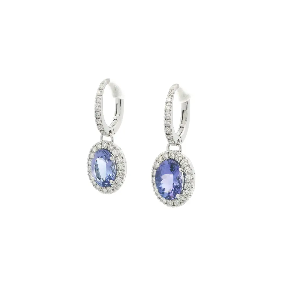 These 18K white gold drop earrings enchant with their refined elegance and captivating sparkle. The centerpiece features oval tanzanites, shimmering in shades of blue and violet, surrounded by a halo of brilliant white diamonds that enhances their natural radiance.