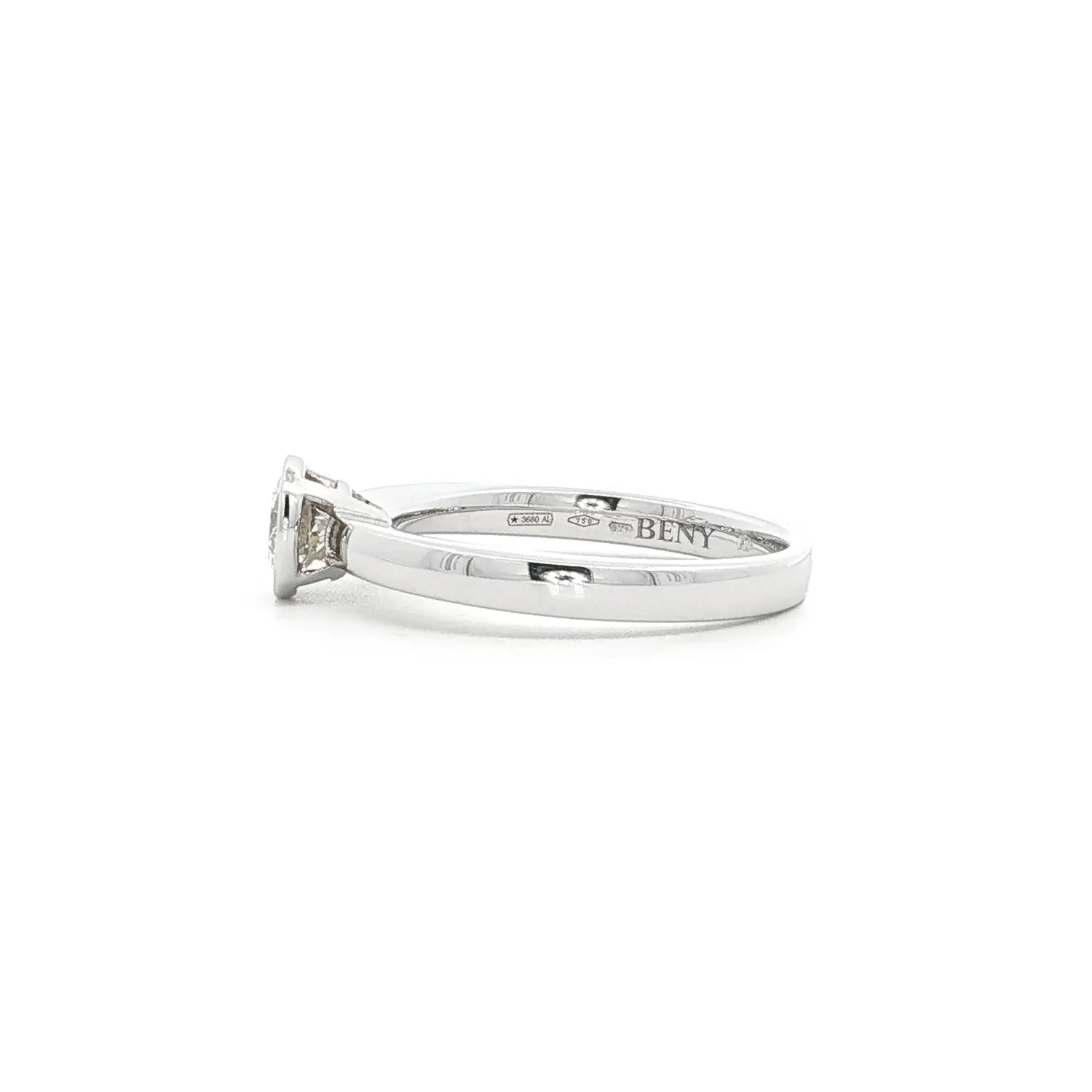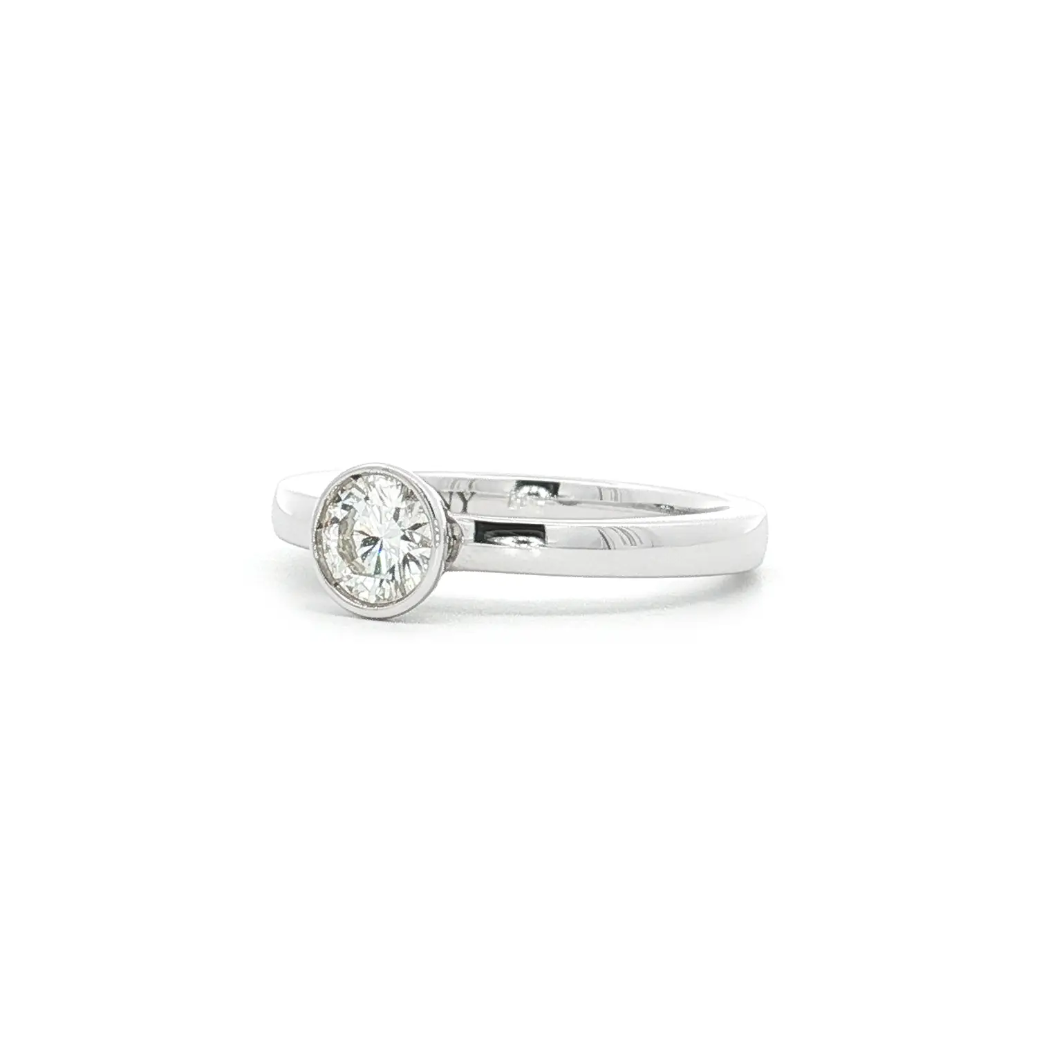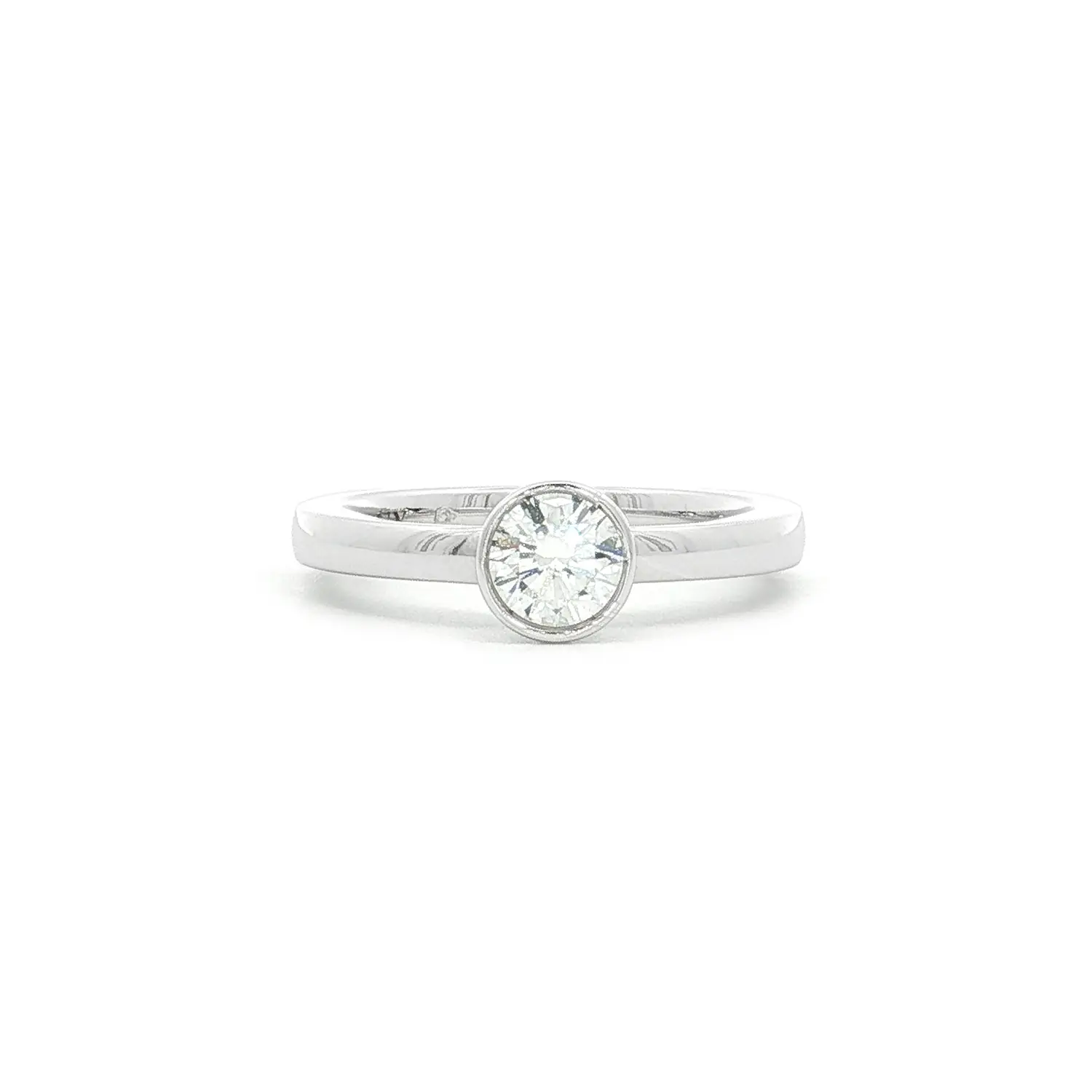 This white gold engagement ring featuring a 0.52-carat brilliant-cut diamond embodies timeless simplicity and refined beauty. The central diamond is securely set in a smooth bezel, emphasizing its brilliance and clarity while offering modern, understated elegance. The sleek design allows the gemstone to take center stage, symbolizing the purity and strength of love.