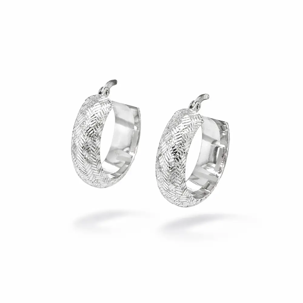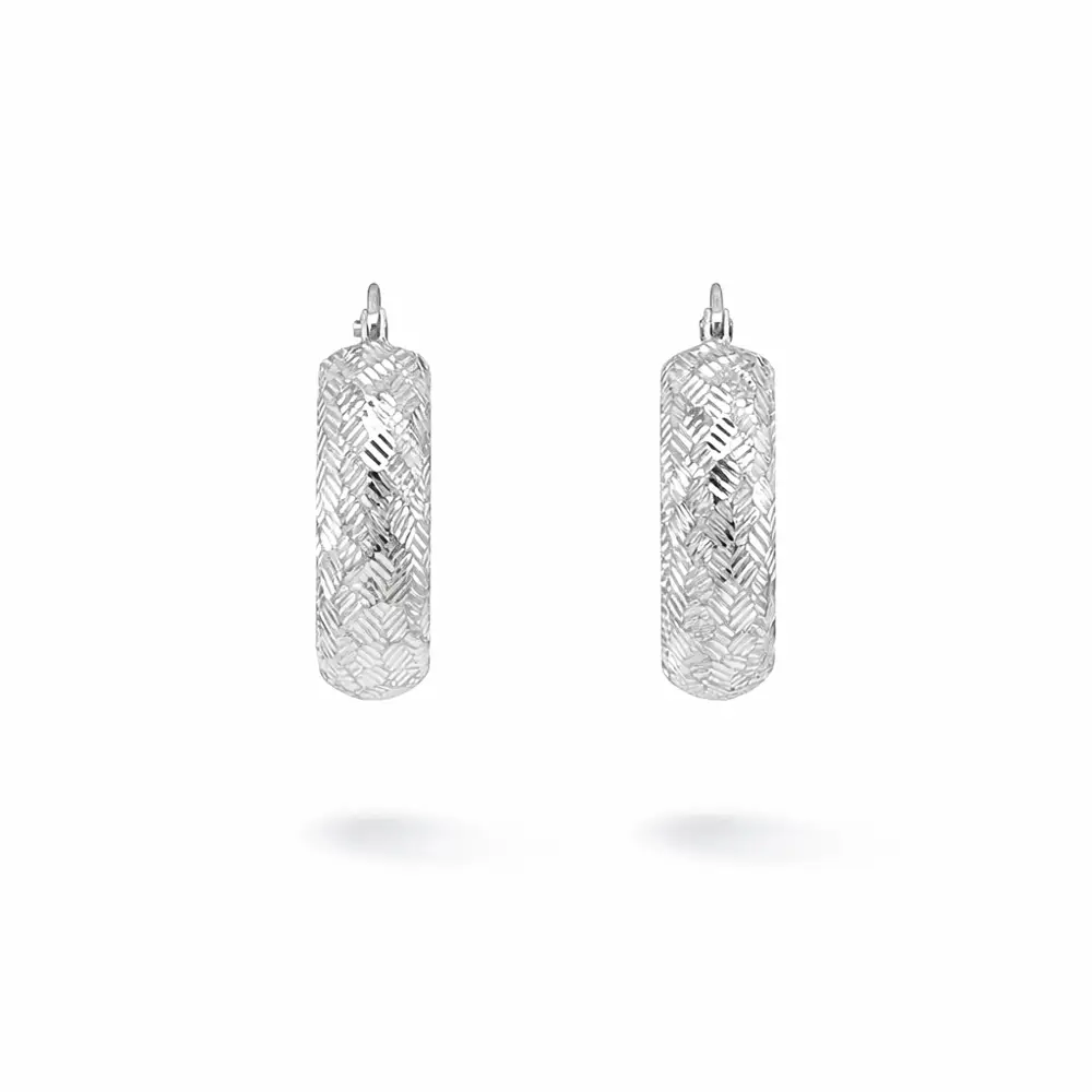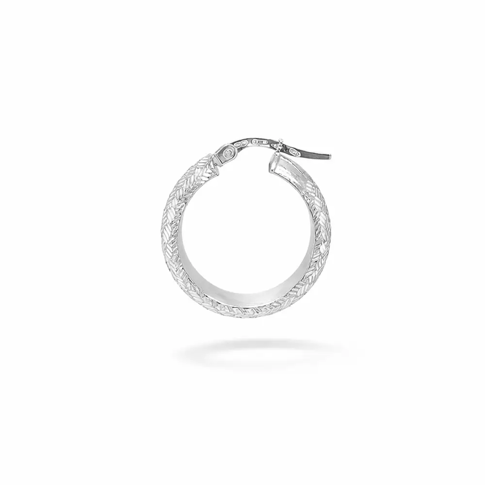 These hoop earrings in white gold stand out with a distinctive engraved surface that creates a captivating play of light and gives the jewelry an elegant, subtly textured appearance. The precisely crafted pattern enhances the luxurious character of the earrings, making them a timeless accessory with a refined yet noticeable effect.