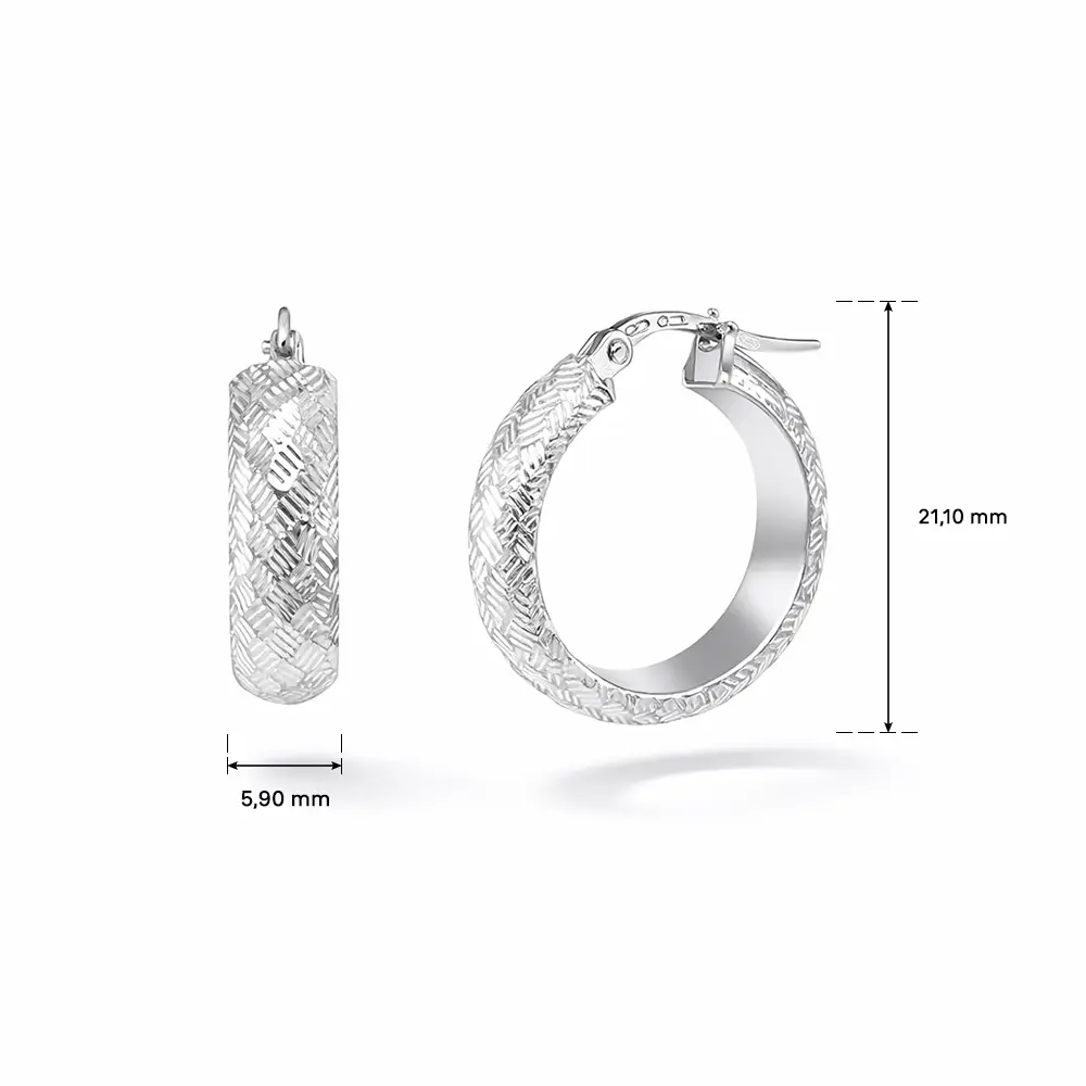 Thanks to the classic hoop shape and secure fastening, the earrings are comfortable for everyday wear. With a diameter of approximately 21.10 mm and a profile width of about 5.90 mm, they appear well-balanced and elegant, easy to combine with other white gold jewelry and suitable for both daily wear and special occasions.
