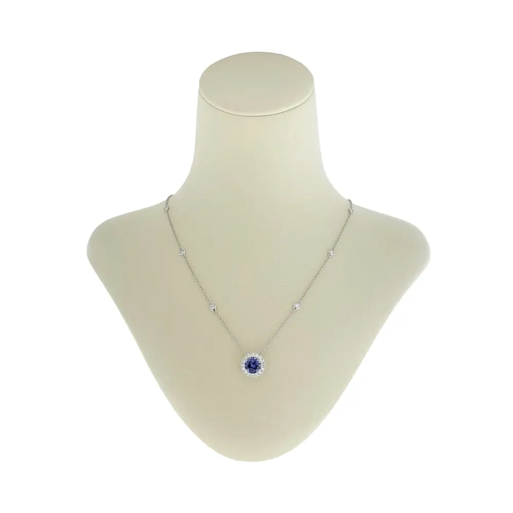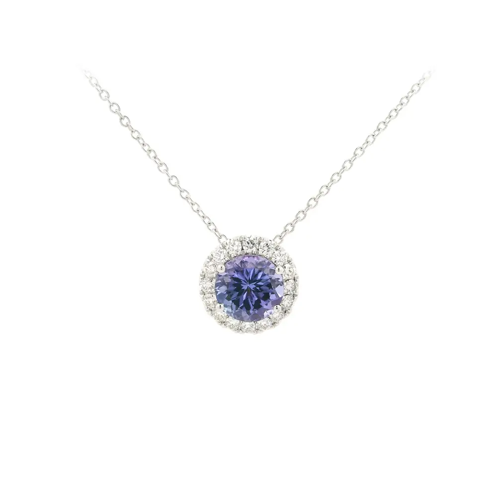 This 18K white gold necklace captivates with its refined beauty and luminous sparkle. At its heart lies a brilliant round tanzanite, radiating captivating shades of blue and violet, framed by a halo of white diamonds that enhance its natural glow.