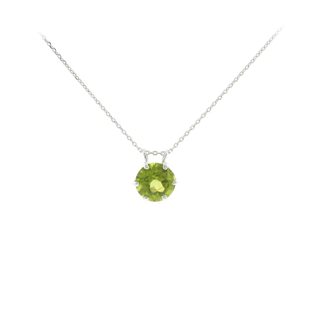 This white gold pendant with a natural peridot 2.00 ct stands out with its fresh color and timeless elegance. The centerpiece of the jewelry is a round-cut peridot set in a six-prong setting, which securely holds the gemstone while allowing its natural brilliance and color to shine. The minimalist design in white gold highlights the beauty of the gemstone and makes the pendant a refined accessory for everyday wear as well as special occasions.