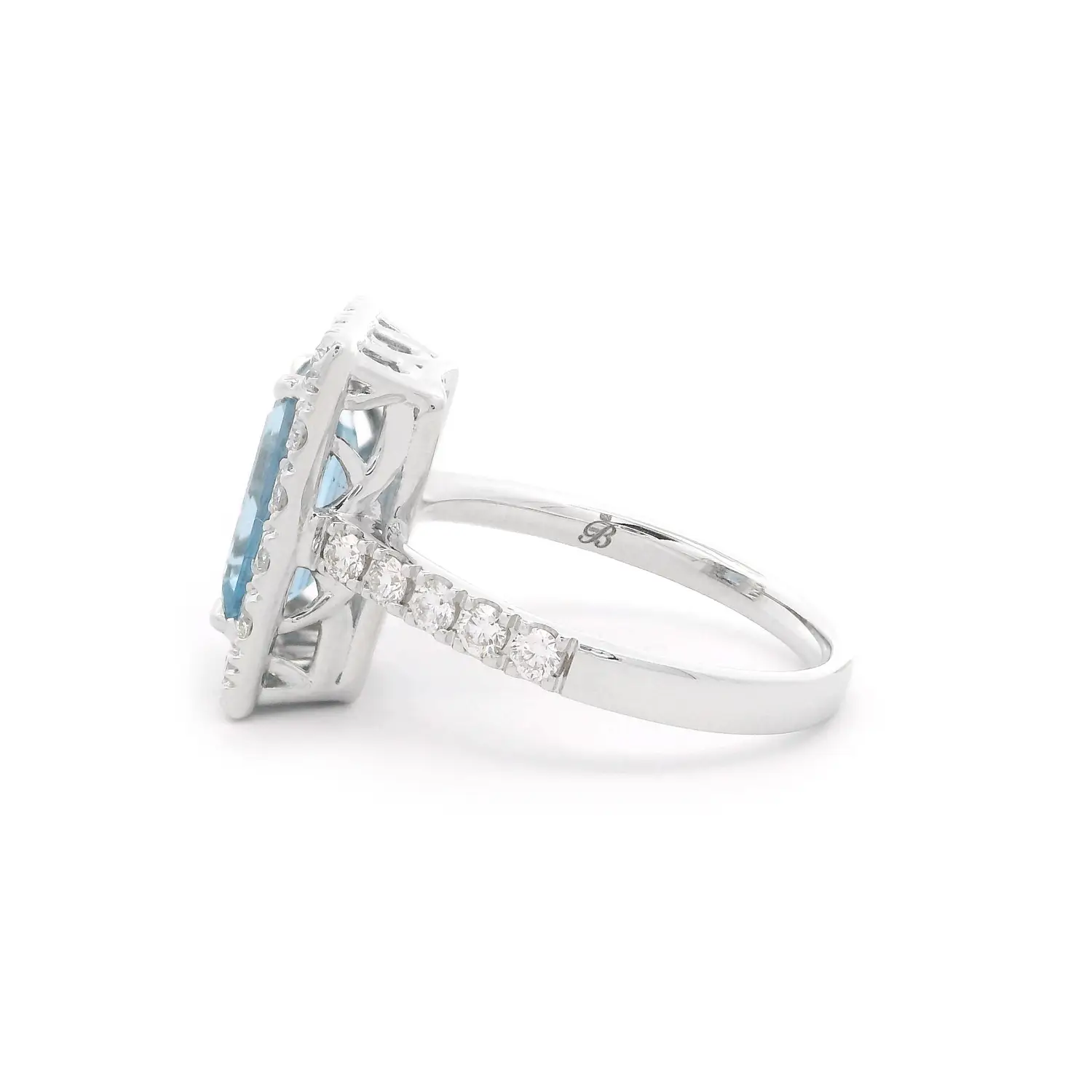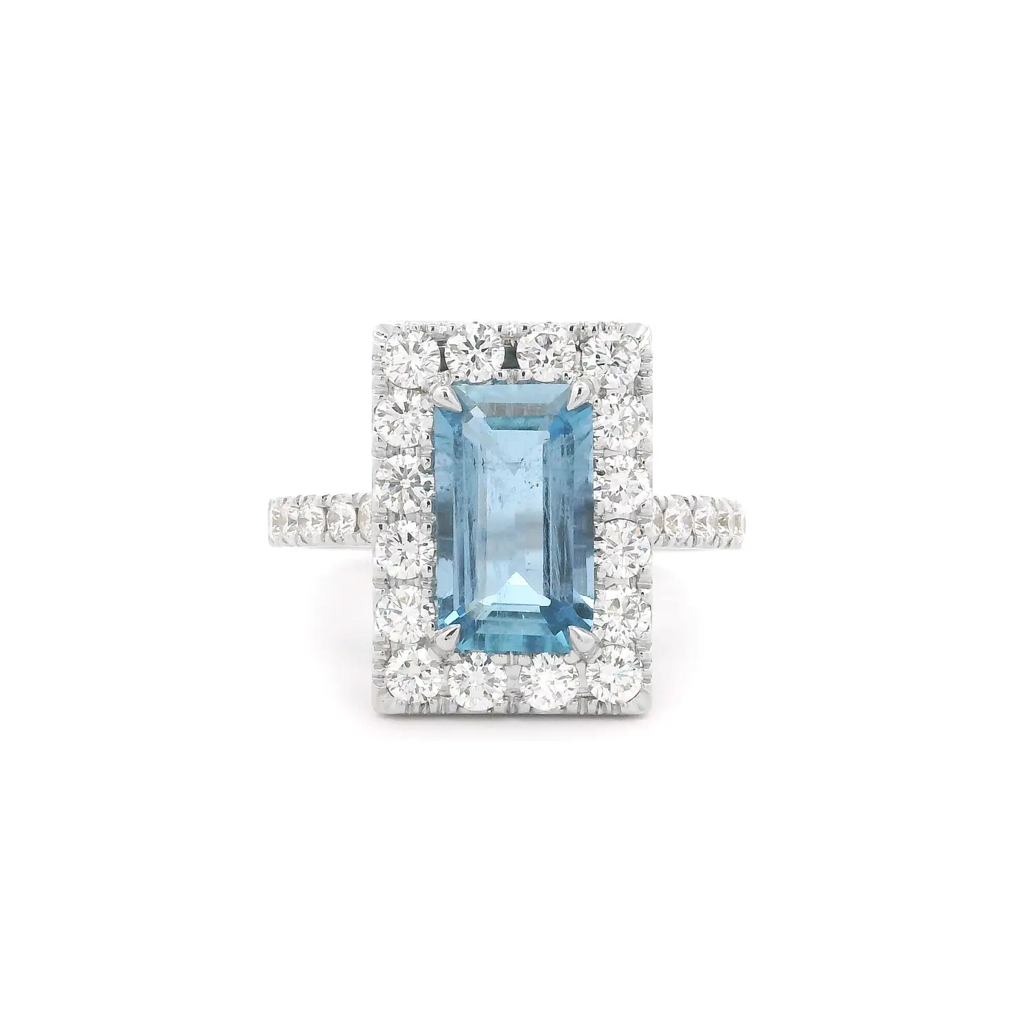 This luxury white gold ring with aquamarine and diamonds is a true masterpiece that combines fine craftsmanship, perfect proportions, and the natural beauty of precious gemstones. At its center sits a rectangular-cut aquamarine with a clear ocean-blue hue — a symbol of calm, courage, and purity. Surrounding the central stone is a double halo of brilliant-cut diamonds, sparkling with every movement and enhancing the aquamarine’s radiance. Their precise arrangement creates an impression of depth and light play, while the diamonds extending along the band complete the design with continuous brilliance and extraordinary elegance.