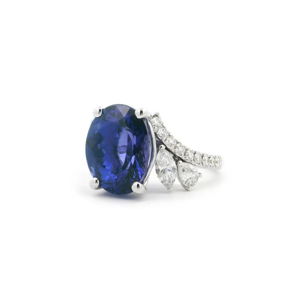 The gemstone is flanked by marquise and brilliant-cut diamonds, resembling delicate petals that highlight the tanzanite’s natural glow. The band, adorned with smaller diamonds, adds even more sparkle and sophistication.