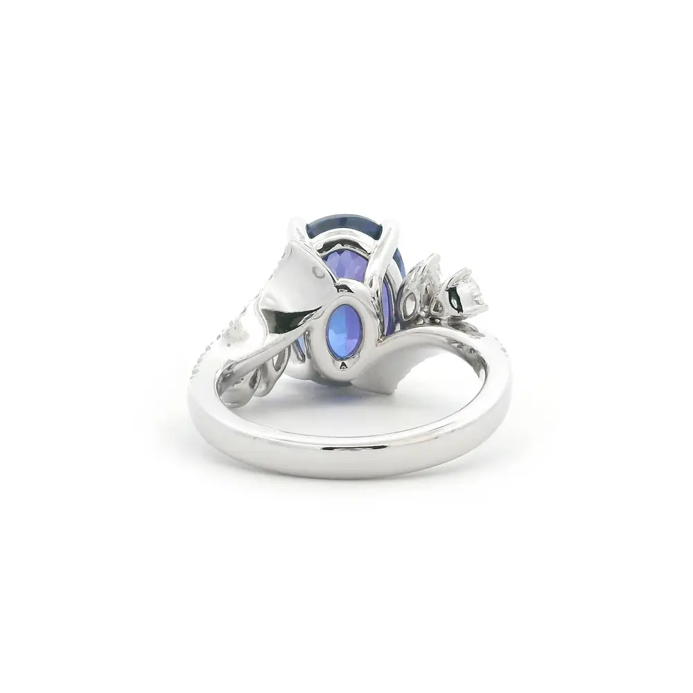 This stunning 18K white gold ring perfectly balances elegance, passion, and luxury. At its heart lies a magnificent oval tanzanite, whose deep violet-blue hue reveals breathtaking brilliance and depth with every movement.