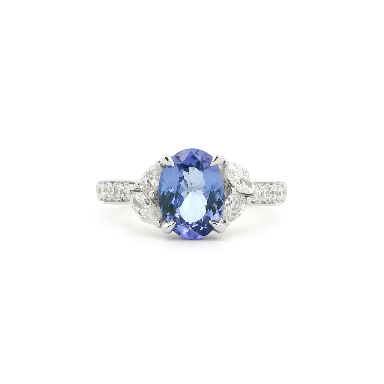 This stunning white gold ring with tanzanite and diamonds embodies the perfect balance of elegance, color, and brilliance. At its heart lies an oval-cut tanzanite, a gem with a mesmerizing violet-blue hue that shifts with the light. Found only in Tanzania, this rare stone symbolizes individuality, intuition, and inner strength. It is beautifully framed by marquise- and oval-cut diamonds, enhancing its depth and captivating luminosity.