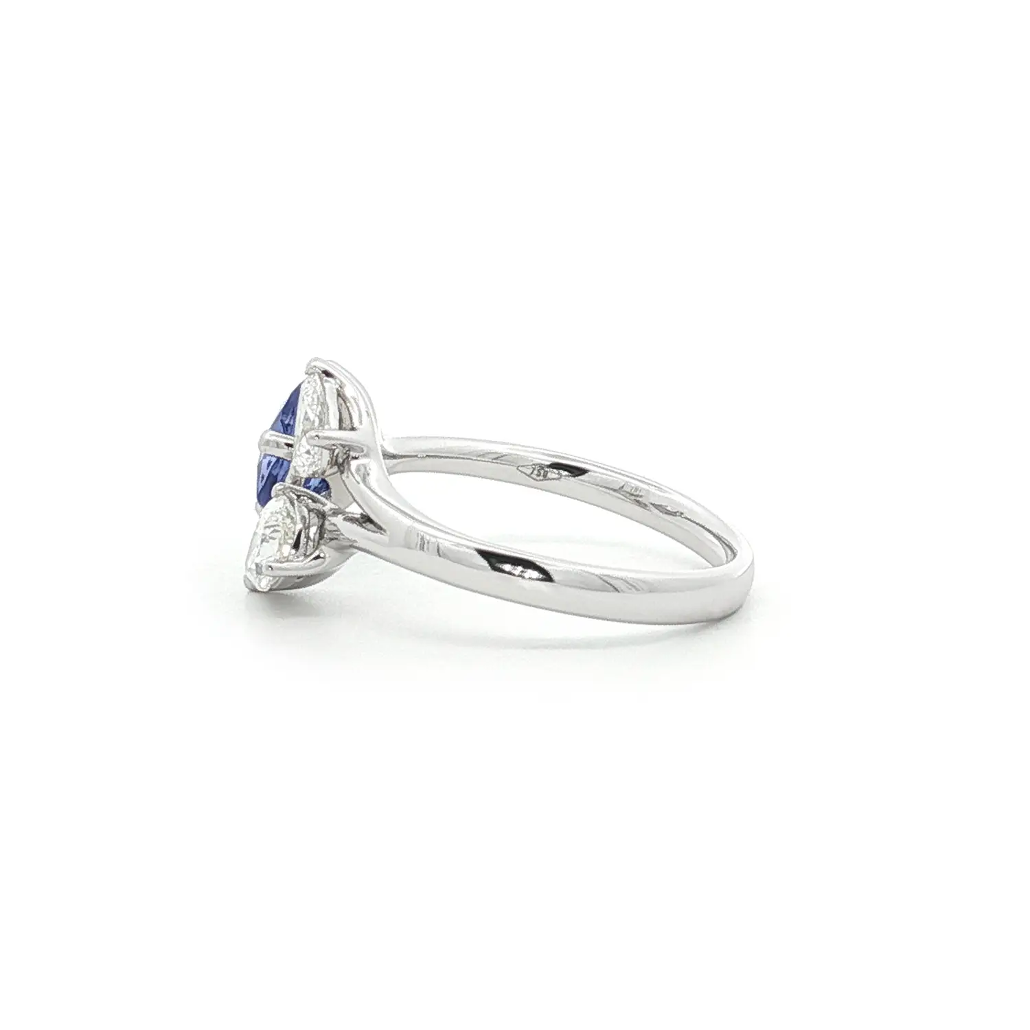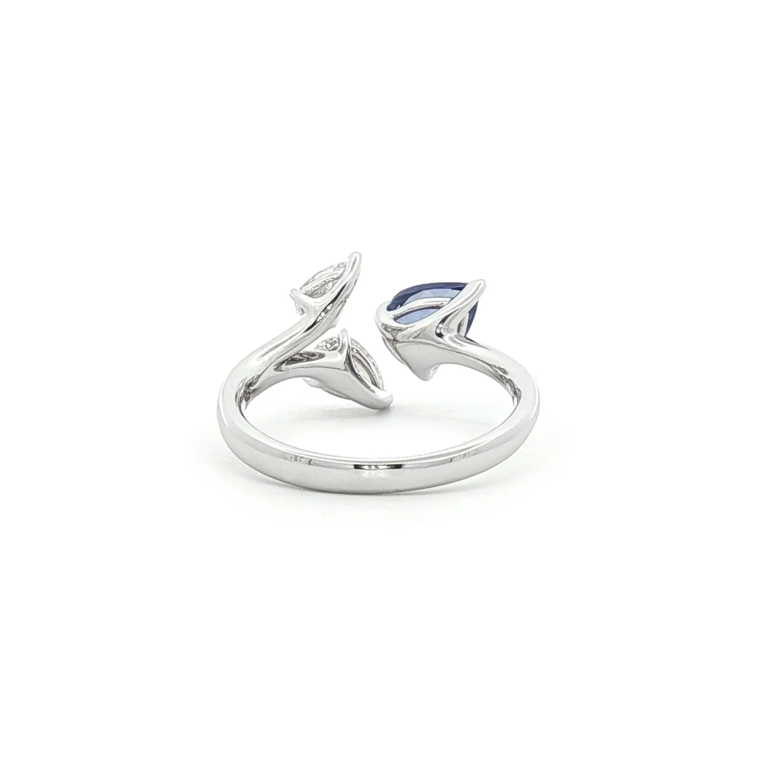 This refined white gold ring with tanzanite and diamonds embodies modern elegance with a touch of asymmetry. At its center shines a pear-cut tanzanite, whose deep violet-blue hue evokes the mystery of the African dusk. Its natural brilliance is beautifully complemented by pear-shaped diamonds, gracefully arranged to resemble delicate petals. Known for its color-changing quality, tanzanite symbolizes intuition, individuality, and spiritual balance.