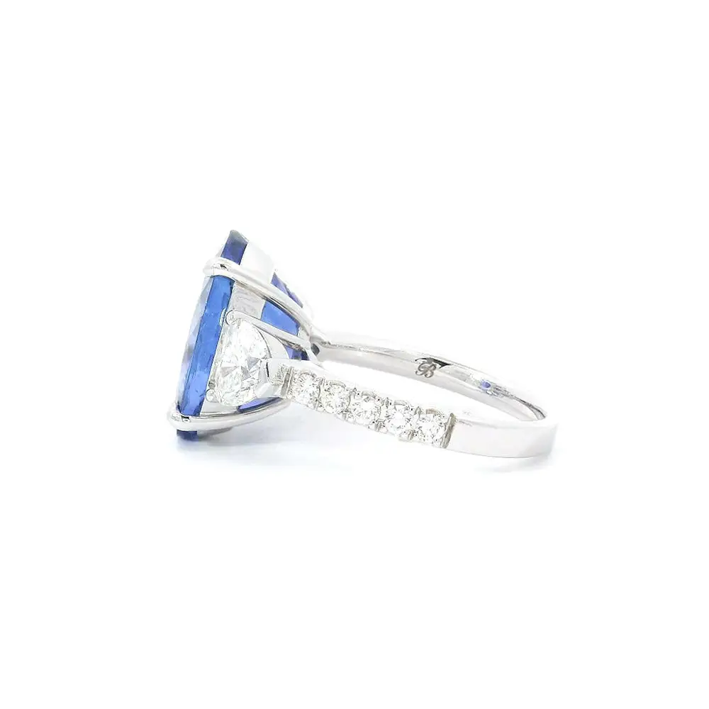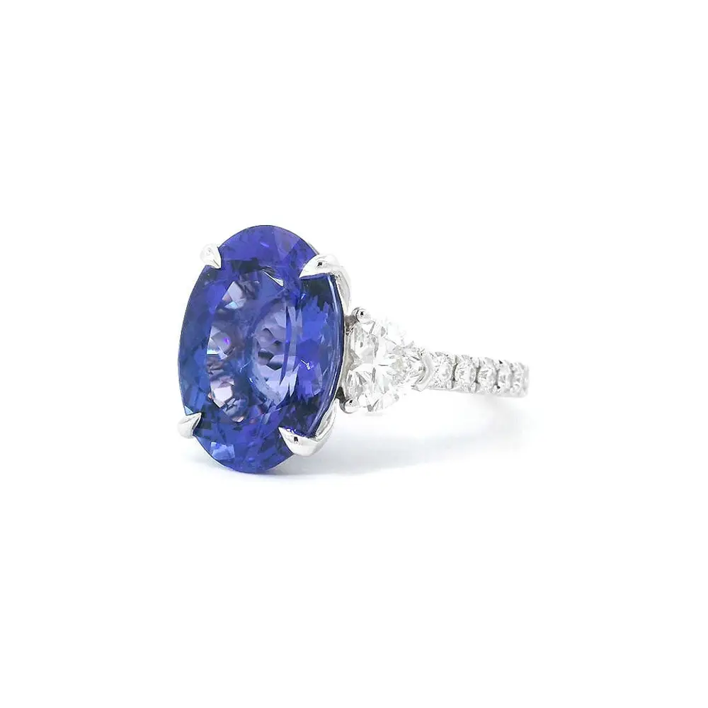 This exceptional 18k white gold ring is a celebration of rarity, elegance and feminine strength. The jewel is dominated by a beautiful oval tanzanite weighing 9.11 ct, whose deep violet-blue hue enchants at first sight.
