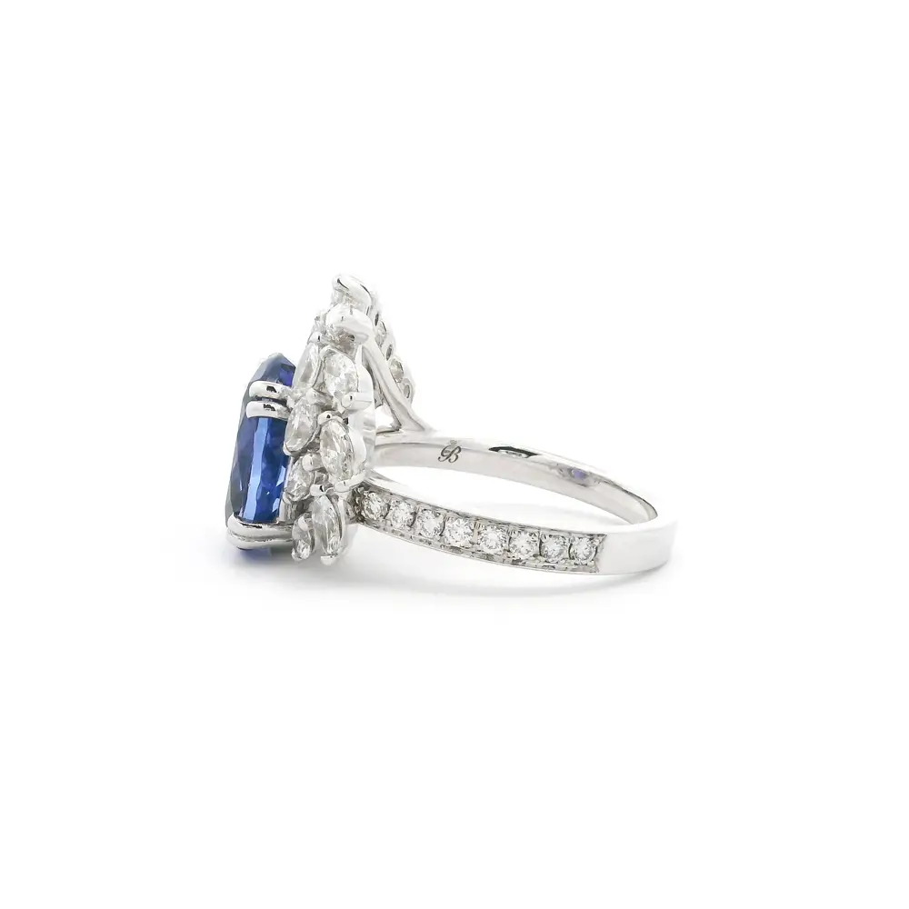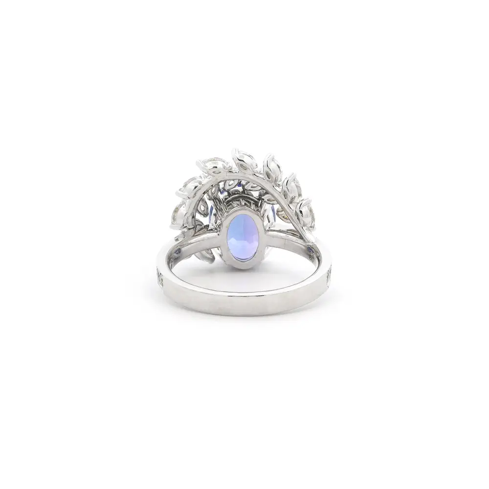 This luxurious ring crafted in 18K white gold draws inspiration from nature’s elegance and artistic design. At its heart shines an oval tanzanite with an enchanting violet-blue hue, radiating brilliance that changes subtly with the light.