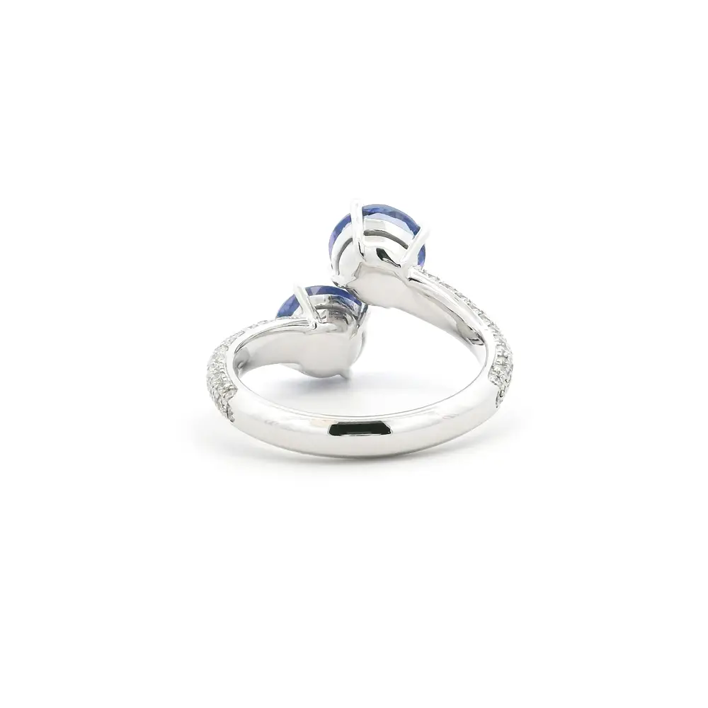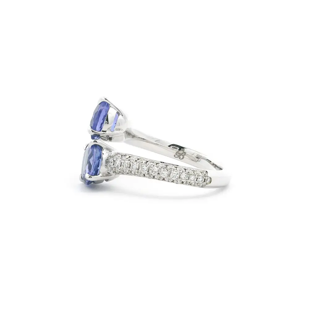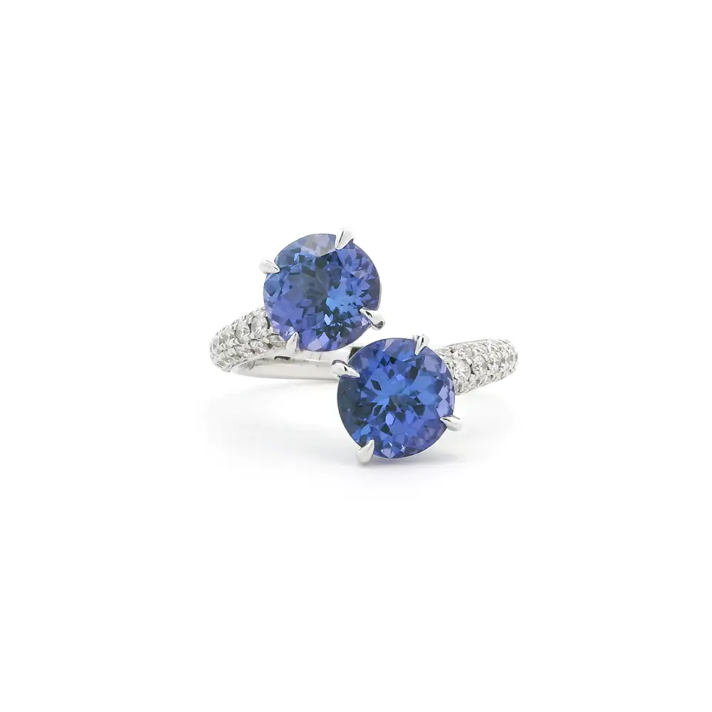 This exceptional 18K white gold ring embodies elegance, originality, and harmony. Its open design features two round tanzanites, symbolizing duality, balance, and the connection of two souls. Their vivid violet-blue tones shift beautifully with the light, revealing mesmerizing brilliance.