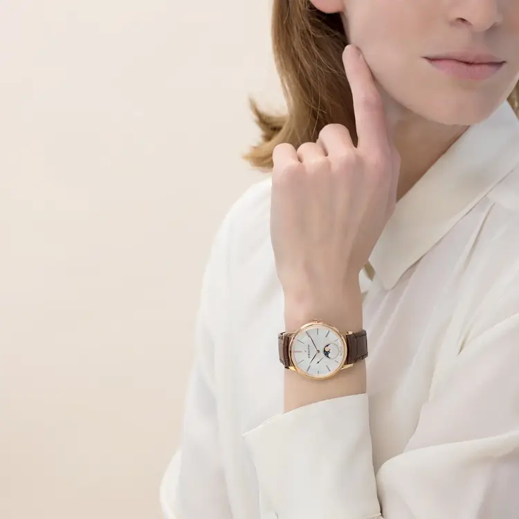 The Elite models feature a slim case, clean dials with a minimalist design and subtle details such as appliqué indices, sub-dials for seconds or moon phases. At the heart of the watch is the in-house automatic movement of the Elite, known for its reliability, slimness and smooth operation.