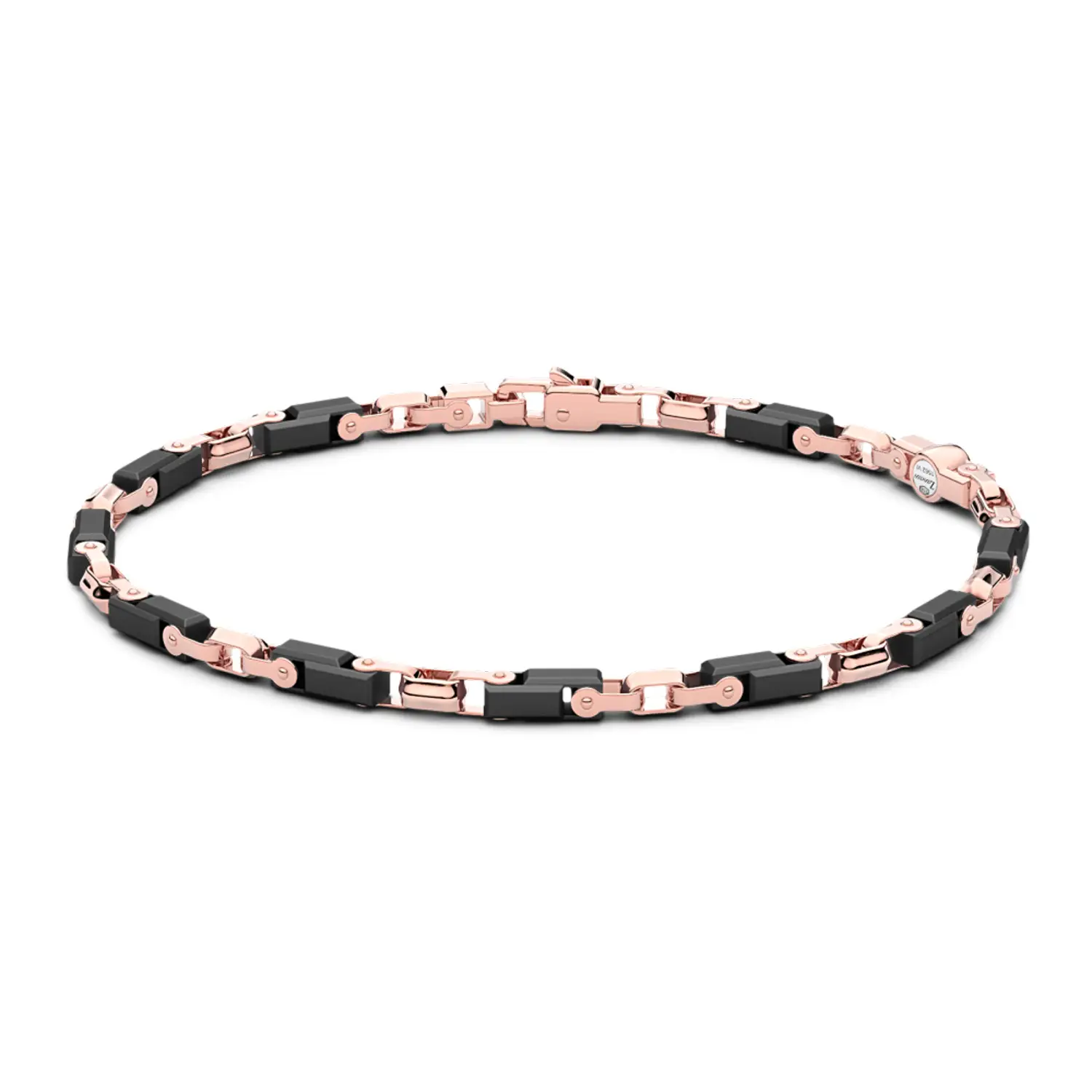 The Zancan Ceramikgold KB041R-N bracelet is a refined men’s jewellery piece that combines 18-karat gold with black ceramic, creating a striking contrast between warm precious metal and a modern, technical material. Its robust construction and geometrically shaped links give the bracelet a confident, architectural look, making it an ideal accessory for those who appreciate luxury with strong character.